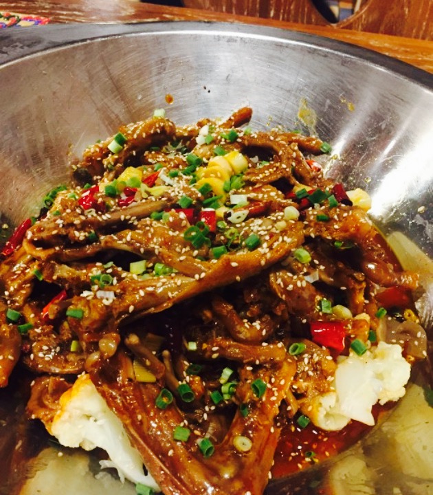 和朋友约在奥克斯,随意选了家吃饭,点了个鸭翅鸭脚拼的锅,口味很重,特别的辣,微辣都很辣,辣的我全程喝了一杯一杯又一杯的水,鸭子感觉是高压锅压的,很软很好吃,不会有啃起来麻烦的样子。非常喜欢免费吃的虾片,炸的很不错,吃了好几盘,还会再来。