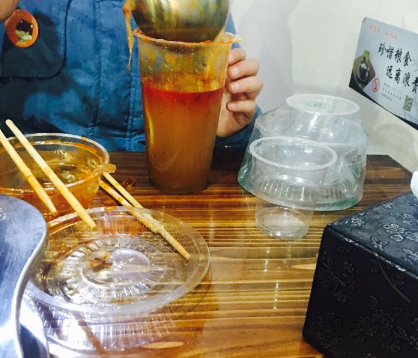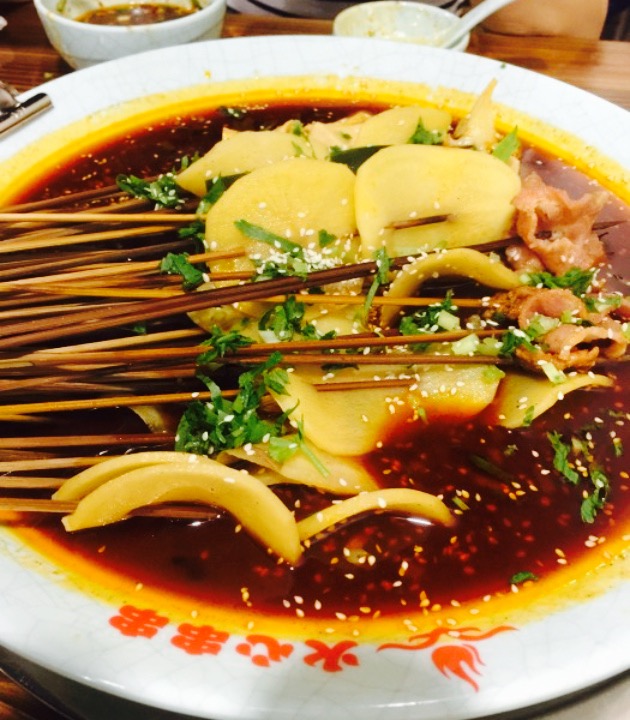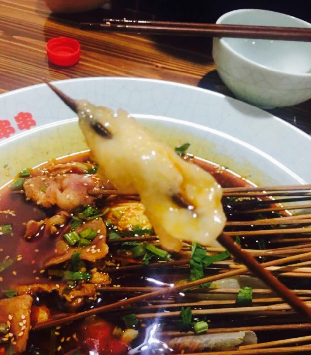 这是我寒假第三次来了,带着弟弟,加餐来的,午餐吃的早,又把江边逛了一遍,他饿了,惦记这家店的热锅,就带着他来了,热锅,就自由很多,边吃边烫,一次一串,慢慢来,叫了个鸳鸯锅,不够辣,这次漂亮女老板不在,是个小哥,我们给他反应了,毫不犹豫给我们加了块牛油,还是不辣,估计下次就辣了,真是想哭,一次不辣,一次辣,又一次不辣,我和弟弟吃了60串,我要推荐一个肚片,我说是牛肚,有人说是猪肚,反正很有嚼劲,至于鸡肉,牛肉,里脊,吃起来都大同小异,没什么意思了,莴苣清汤锅里煮的不错,还有土豆片,弟弟对油条和腐朽,蟹排很是偏爱,鱿鱼看起来不是很清新,其实我想吃鱿鱼须,但是那是在盘子里卖,怕吃不完,没点,最爱的鸭血也没吃,哎,不舒服,弟弟后来做了一杯黑暗料理,采用冰柠檬,热清汤,热红汤,勾兑而成,颜色诱人,味道,哈哈哈,我骗他自己喝了,眉毛都皱了,我没有尝,两个人吃了60,不是正餐,老板娘这时候来了,给减了十块。