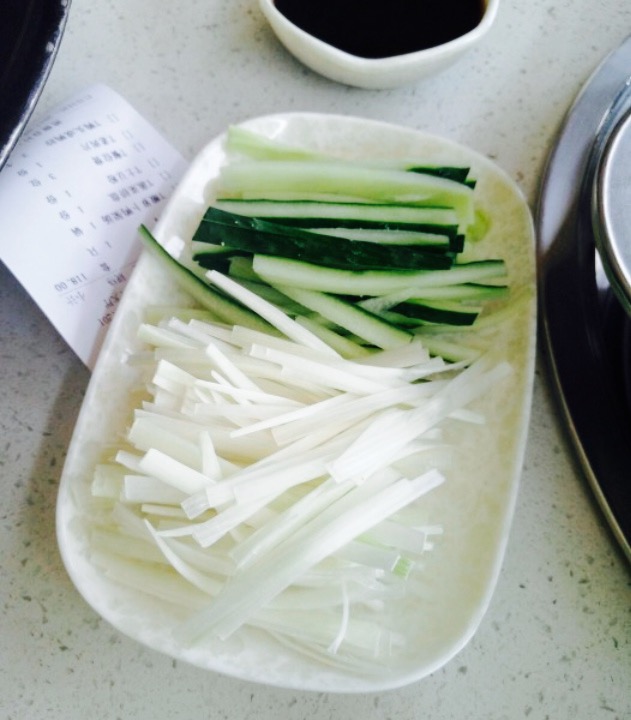 烤鸭是主餐,烤得还算不错,鸭皮比较脆,甜酱咸甜适中,饼皮也比较筋道,加上些黄瓜丝葱丝,吃起来口感不错