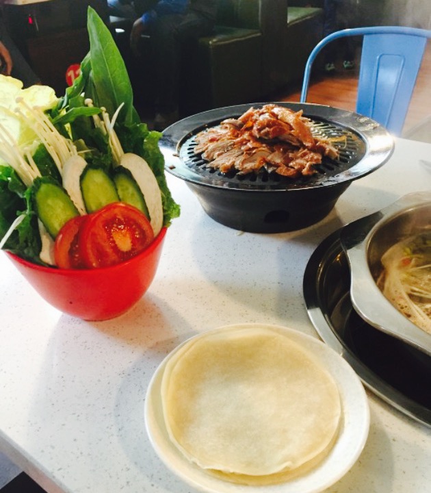 两个人团购的套餐,烤鸭是主餐,烤得还算不错,鸭皮比较脆,甜酱咸甜适中,饼皮也比较筋道,加上些黄瓜丝葱丝,吃起来口感不错。除了烤鸭,还有一盘蔬菜供烫着吃,一碟凉拌黄瓜和酸萝卜鸭汤。蔬菜比较清新,但觉得质量都不太好,以老叶子为主,凉拌黄瓜比较老,勉强吃吧,鸭汤还行,越煮汤越浓郁,烫菜吃都有味儿。自助吧台有蛋炒饭,爆米花,冰粉,西瓜等可以自取,品种还是多,味道一般吧。总的来说,这个价位吃成这样还是可以了,实惠。