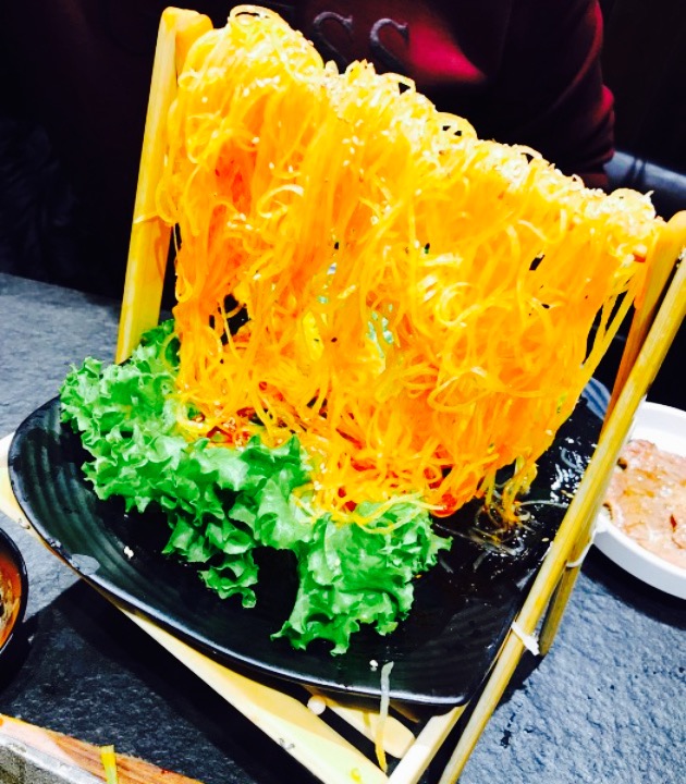 来丹东玩儿,朋友推介的店,服务超级不错,常常要排队的,烤肉不错,酱汁充足,小料是自助,跟水帘洞似的那个是土豆丝,我看桌桌都点,老公也点了,不过并不入味,基本就一人尝了一口,辣炒花蛤没熟,一口就给我吃恶心了,跟服务生说,可是服务员没听明白,以为我们吃不惯味道,就回锅加了些酱料,但其实是因为没熟,冷面中规中矩,点一碗很清口。跟老公俩人点的有些多,大胃王老公都没吃了。