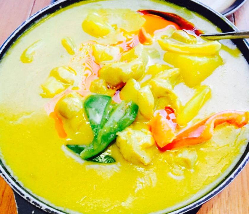 相当赞的泰国菜。西双版纳应该是国内最能吃到接近地道泰国菜的地方了吧。冬阴功汤味浓料足。炒虾中规中矩。猪颈肉炒的太入味了,根本停不下来。红咖喱牛肉非常醇厚浓郁,肉也好多,拌米饭能吃几碗。青柠鱿鱼很美味,酸酸的。芒果糯米饭现做的,米有些硬,不如泰国好吃。椰浆味道有些怪。整体还是非常特别棒的,吃到一半还有少数民族姑娘来表演问候。坐在亭子下,点着昏黄的灯,外面芭蕉树滴着雨滴,很舒适。