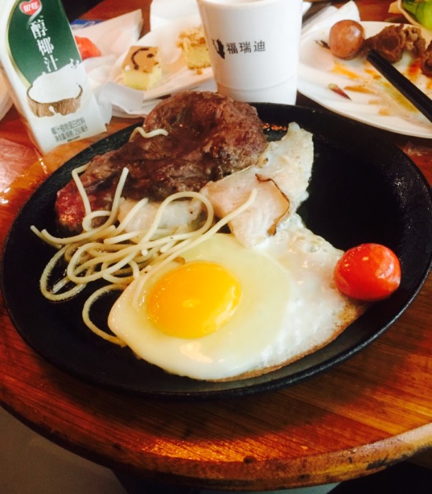 今天天气很热,跟朋友出来逛街,到了中午没想好要吃什么,朋友就说干脆去吃自助吧,省的想了,我也同意了,我俩简直绝了。因此就去了隔壁一家自助牛排,刚进去人不少,不过服务人员也不少,小哥哥态度超好,颜值也在线,把我们带到了座位,然后开始点餐,还有好多水果,披萨,热菜可供选择,牛排是吃一份点一份的,最爱川香牛排,吃了两份,还吃了鸡排,鱼排,羊排,撑死呀,大体上是不错了。