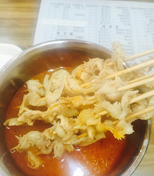 经过这边,走着走着,凭着吃货敏锐的触觉,看出这家就感觉有必要进去品尝。果不出所料^O^,网友攻略打开一看,还有点争议,更引起我的好奇心(吃货还用找理由么??)。点了三个肉串,两个面筋(其实我对面筋无好感,只是看到有强烈推荐的),一个红腰。不饿就是馋,品尝??。肉串没有说的那么多,但口感还不错。