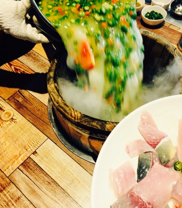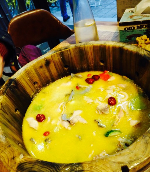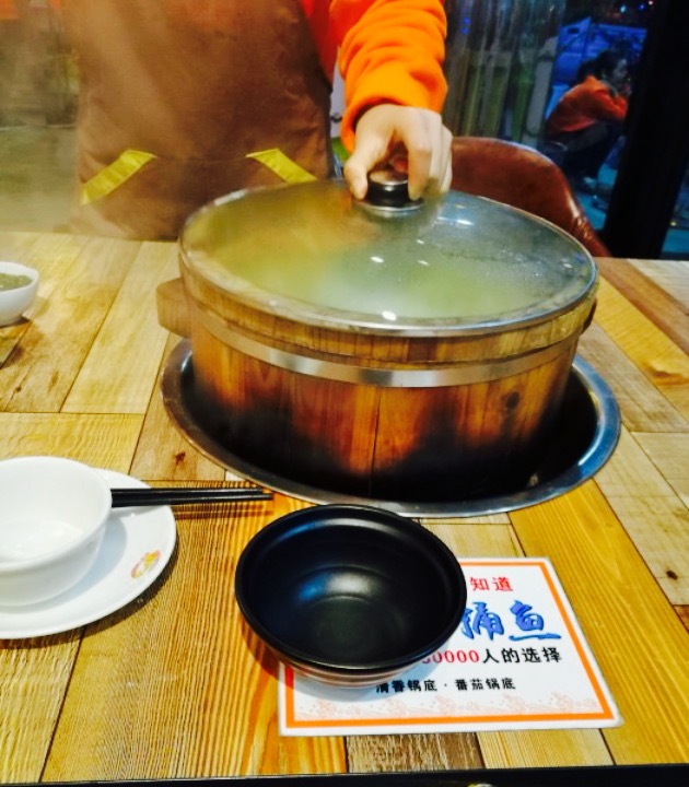 好运气的抽中了张记木桶鱼,不过地址在华阳的二江路二段235号,对于我们这样的不太熟悉华阳的人来说觉得有些偏,我们专程坐了差不多1个钟头的地铁,再坐十分钟左右的滴滴过去才到,出巷子口就能看到川庆油建综合大厦,估计是这里的地标性建筑。我们去的时间比较早,店里宽敞,浓浓的工业装修风格和墙上挂着简洁的解释,旁边是小吃的现场制作区,还有一个小小的自助区,用餐环境看着还不错。从我们第一桌坐定到大堂坐满不到20分钟,这个时候大概才下午五点半 。服务员将铺了烫烫鹅卵石的木桶也搬上了桌,把生鱼片放在鹅卵石上倒入鱼汤,几分钟就可以吃了。鱼肉细嫩,鱼汤雪白,配上秘制的蘸酱,味道好极了,最关键的是他家的性价比不错,特别是最近还在搞活动,吃下来更加优惠,推荐。