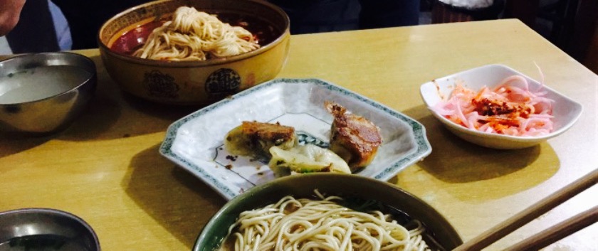 店面见图一,一个非常特别小的门脸,点都不起眼,我们寻吃的,也压根儿走过了,后来弟弟说你不是要吃饺子,这儿有。好吧,看看店面我压根儿没太多食欲,走得有点累了,凑合着吃吧。掀起链子进去,我们就吃惊了,人暴多,本来店面不大,桌子摆满了,人多得不得了,我们差点被吓出来了。老板引我们往里走,一条窄窄的通道,里面七八张桌子,也坐满了,而且都是本地人,有喇嘛,有一大桌子兵哥哥,还有其他民众,我们是唯一一桌游客。环境我不能说好,总体还算整洁。生意好了。吃的呢,我们点了饺子,锅巴,牛肉面,鸡杂面,酸菜素面。先说饺子,图二,我不喜欢吃韭菜饺子,就要的鲜肉,六块一两,包的模样确实不怎么的,不过面和蘸酱非常鲜美。他们这里的锅贴就是煎饺,韭菜馅儿的,四块一两三个。我虽然没吃,只是看隔壁当地人吃都是一斤一斤的叫。鸡杂面,图三,汤色有点重口,我尝第一口就惊艳了,非常赞。我弟弟先吃了三两,然后又叫了一两。面是九块一两,十四块三两。我们用餐的当儿计算店主一天的收入,差不多会上万呀,如此好的生意。康定的物价还真心不低。