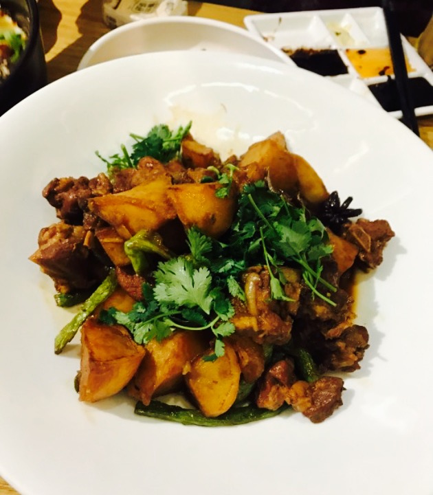 黑豆苗和鸡蛋干超级好吃,咸香适中,很赞,新加坡咖喱鸡很有新意,鸡块和汤汁盛在一个空心面包里,咖...