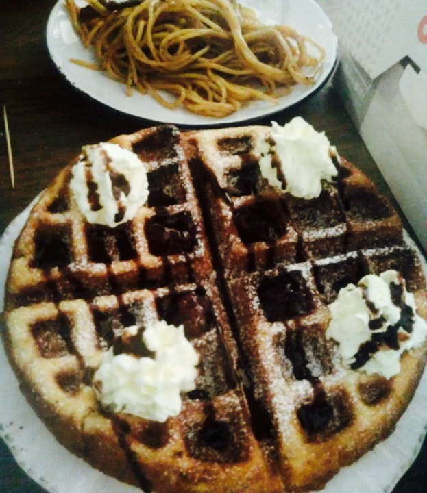 门店看起来很小的店,看到一楼有放小吃的广告牌,才选择这家的。上了二楼真是另有一番天地。很喜欢这家店的装潢。复古做旧带清新感。每一个灯都是水管的样子,沙发也都很复古。铁网上还挂着小盆栽,桌子上的垃圾桶都是木质的那种,厕所的地砖也是涂鸦风格的。老板肯定是个特有个性品味的人。细节是我定义一家店层次的重要标准。哈哈哈,很适合拍照其实,但就是光线太暗。【抹茶拿铁】清淡而且不是很腻的那种,抹茶味道刚刚好。【港式奶茶】非常大一杯,这么实惠的样子。是我喜欢的港式味道,浓厚的茶味,淡淡的奶香,少糖,不是很甜的那种。要的热的,喝起来很香,如果是冰的,喝起来也一定很爽。【原味芝士蛋糕】芝士味道不是非常浓,所以不是非常腻,挺好吃的。最下面一层味道很不错。【华夫饼】要的抹茶口味的,可是没吃出来,烤的面皮很硬,咬起来还蛮有嚼头的。还是值得推荐的。