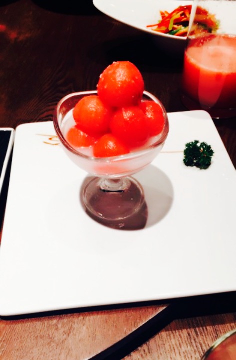 来过几次,都因为没有座位没吃上,这次终于有座了,装潢是很大气的新中式风,很精美的桌椅和餐具,入座后点了几个推荐菜,口味整体比较清淡,食材都很清新,小番茄甜甜的,榴莲酥能吃出榴莲果肉,牛肉粒也是很嫩,类似海螺比较辣,而且吃起来比较麻烦,本人不是太爱,水果虾本来以为是类似芥末虾球那种,实际是水果虾沙拉,本人更喜欢热热的虾球的那种,虾饺皇是比较入味的,不像有的家外皮都烂了,豆花鱼没有拍,是很推荐的,鱼肉很嫩,没有刺,微辣。烧鹅,应该是,不大记得了,无功无过,是比较瘦的那种,肉饱满的就几块,其他骨头居多,整体来说,环境满分,菜整体满意。