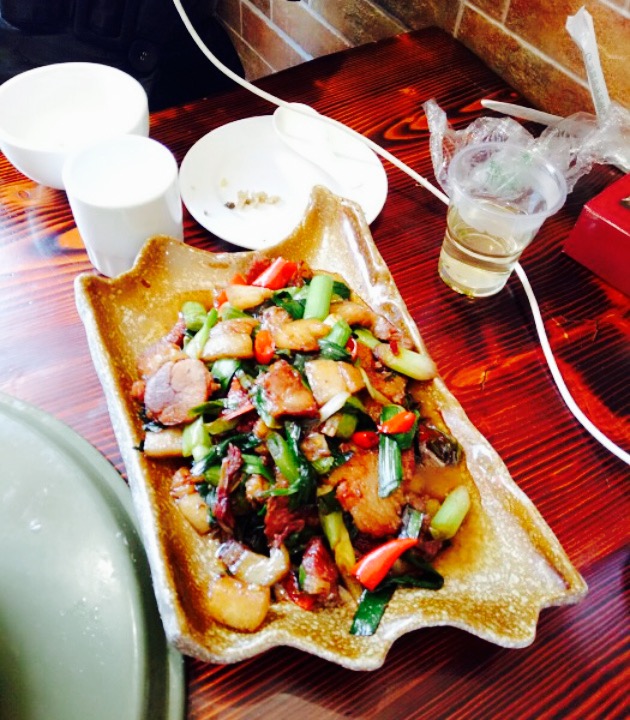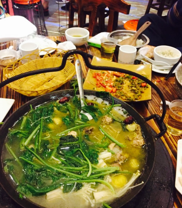 到毕升来泡温泉 。刚好碰见这家新开的小店 。这里最著名的就是吊锅 。点了一个小份的腊三鲜 。份量特别大 。四个人几乎剩了一半 。三鲜是腊鱼 。腊猪脚和腊鸡 。配菜也好多 。还有些当地农家自制的 。没吃出来是啥 。 。丸子也很多 。口味是咸鲜的腊味 。本人不是很爱 。爱吃腊味的朋友可以试试 。还点了菜苔腊肉 。蒜香排骨 。五香牛肉 。和下锅的鱼丸 。排骨和牛肉还不错 。份量也挺大的 。鱼丸跟武汉的不一样 。口感好软 。觉得没有汤逊湖的好吃 。反正所有的东西份量都好多 。四个人 。三个菜一个锅 。四个人没吃完 。锅还剩一半 。整体还行吧。