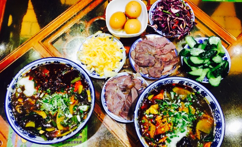 原本想去北滨河路的那家牛肉面,叫啥我忘了,去兰州前攻略好的,上了出租车,老板说北滨河路有3家大的牛肉面馆,都是给外地人吃的。嘿嘿,我们来之前特地挑了不去外地人去的牛肉面馆,比如马子禄牛肉面馆,哈哈哈,还是被当地人嘲笑了。请出租车司机带我们去一家当地人去的,司机把我们带到了这家,绝对当地人来的馆子,之所以只点了一碗牛肉面,是因为已经吃了好几顿了,另外点了一碗二和面。这种面味道都不错,点了牛腱子和牛肉,也挺好吃的,这家的面汤和思泊湖的面汤味道是一样的,芹菜水的味道,嘿嘿,点了热冬果,好喝,实际上就是梨水,呵呵。老板娘看我在照相,给了我们一张名片,说要是还想吃牛肉,可以快递。不错。兰州人真是从早到晚吃牛肉面,随便一个饭馆里面的人都多,本人认为想吃爽口的,就看哪家人多进去就行。
