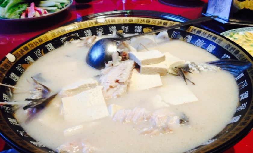 来密云调查,当地大哥坚持要请客,密云农家菜里鱼是必点的,大哥特意提前两个小时就让商家把鱼头炖上了。吃鱼必来鱼街,我来鱼街已经很多次了,圣霖荷园还是第一次来,菜馆在鱼街深处,不在人头攒动的大街面上,小院里还盖一截仿古长城,很有趣。工作日中午,人不算多,估计周末或节假日就没那么清静了。点了特色菜炖鱼头,焖酥鱼,酥炸鱼,还有花椒芽,香椿鸡蛋,农家炖肉和一堆凉菜。就餐的时候被提醒鱼头一定要炖到汤汁浓稠才能入味,农家饭不很精美,但吃得舒服痛快,畅快淋漓。