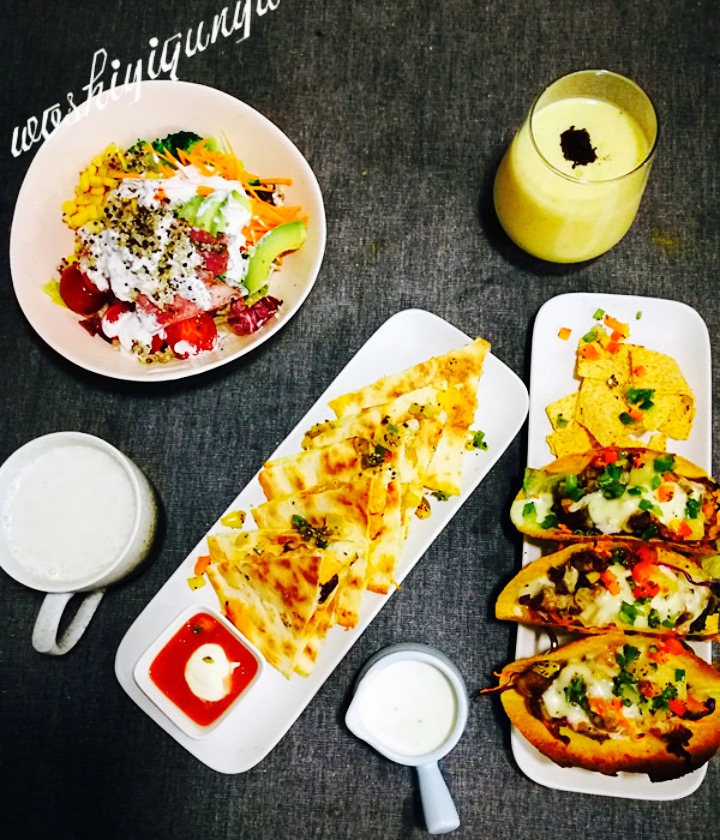 环境,临时找的用餐的地方,位置不是太好找,因为在楼里所以店面比较小,只有三桌好像,不过这个桌布拍照片还挺漂亮的哈哈哈。服务,我们去的时候没有人,老板娘很热情地招待,所有东西都是现做的,稍微要等一下。菜品,点的是双人套餐,没有踩雷哈,两个女孩子吃刚好,思慕雪一个是火龙果的,一个是芒果的,但都有一点淡淡的香蕉味,是鲜榨的,味道很好,沙拉也蛮好,一个馅饼一个卷饼。