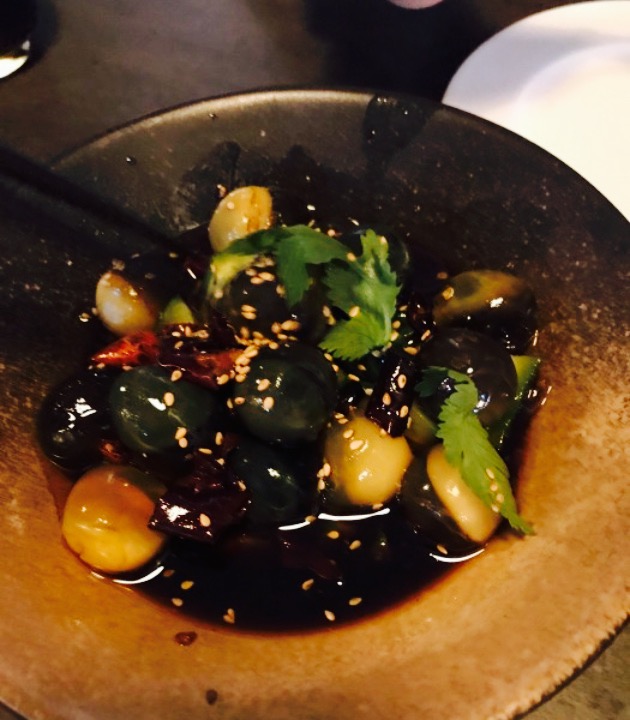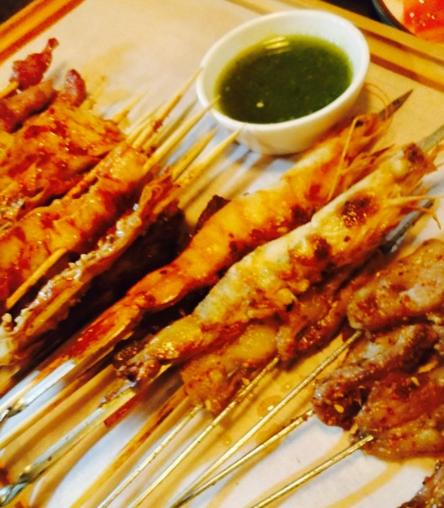 对这家绿色串串蘸料充满了好奇。某日聚会带着好友们就来了 。人还好多呀,如果不提前打电话预定就没位子了。店里空间不大,桌子间隔小。外面也可以吃饭。几乎点遍了招牌。#澳洲牛肋串#。牛肋肉烤串第一次吃,偏甜口。绿色的酱是甜辣咸的样子,配搭在一起很爽口。本人觉得串里筋比较多,嚼不烂。#梅花肉蘸酱小串#。猪肉就相对嫩一些啦。还是配着酱好吃。#桂花西红柿#。桂花酱的口味好奇怪啊。大家都感觉有股沐浴露味,还开玩笑说吃一会儿大家集体吐泡泡哈哈哈。但是有的同伴觉得味道还行。#炒方便面#黑胡椒味道的第一次吃,挺好吃的,就是感觉18一份量有些小。还有别的正经烤串,熟筋腰子啥的都挺好吃的。炸土豆片要推荐一下,薯片的口感。还有炸蘑菇也很出色。