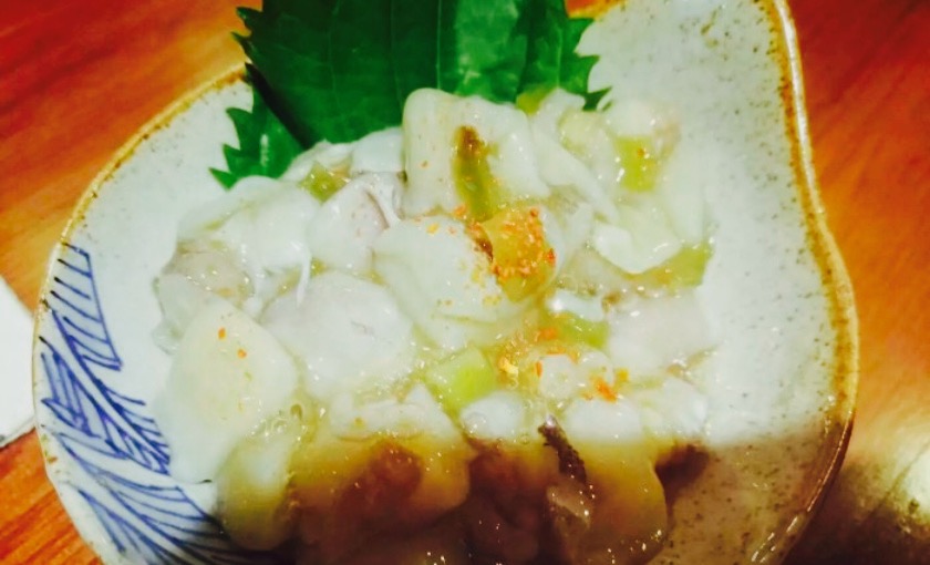 半夜游荡觅食,偶尔发现的一家小店。在一番街一楼最里面,清净而且干净。在吧台坐下,点了几个小菜。老板上的热茶,泡茶的米是用心炒过的,很香。芥末章鱼很清新,味道不呛,正好。香菇肉丸刚烤好时,闻起来,吃起来有特殊香气。鸡肉丸放在了一片青椒上一起吃,很好玩的新意。烤牛舌很嫩。烤鸡脖子肉配白萝卜泥,口感很弹,很棒。简单的茶泡饭,鲑鱼和菜肴都很用心。餐后老板赠送了芥末冰淇淋,很有意思的味道。整个吃下去,有种意外的惊喜。另外,居然发现和老板娘是老乡,惊喜又添了一层。门店新开,老板娘还给打了折。出门时,两人一齐送至门口,我们走到一番街出口,老板还在门口微笑送别。很好的店,纳为我的保留节目,肯定会再来。