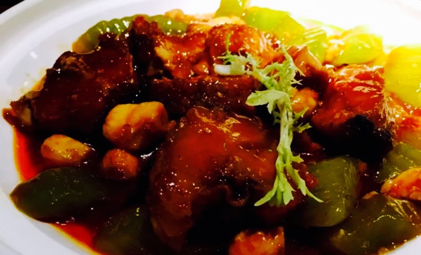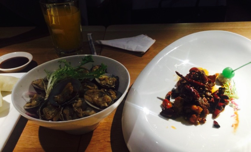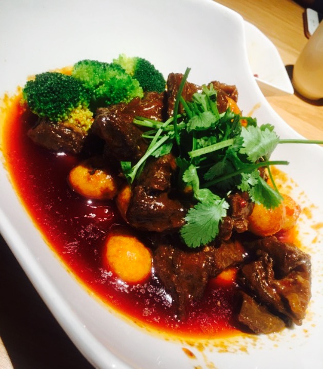 高大上的重庆天地,朋友带路过来见世面(捂脸),各种有格调的食堂,眼花缭乱,最后选定这家开业不久的融合菜,一眼看中的环境,玻璃房,简洁风,室内外都可以落座,晚上天气好在室外落座很有调调。位置醒目,在电梯旁边,鲨鱼餐厅隔壁。难得遇到的满分餐厅,有颜值有内涵??桌距很大,私密性不错,适合约会聊天。店员态度很好,主动告知菜分量足,不要点多浪费,加水应答都很快,有菜品售罄,老板娘还亲自出来道歉btw老板颜值好高??。豆筋棍烧猪尾,很接地气的菜品,猪尾软糯,满满的胶原蛋白,粘嘴巴,豆筋棍浸入肉汁,十分爽口,米饭杀手。牙签牛肉,难得在这种环境下吃到大排档的味道,牛肉选材上乘,没得筋头,火候正好,肉质不柴,入味足。松鼠鲈鱼,第一次吃鲈鱼做的松鼠鱼,肉质细腻,几乎无刺,它家酱汁比较特别,番茄味突出,回味一点甜,多吃几口都不会腻,一个人干掉大半条。虾饺皇,口感饱满,三只虾应该有的,鲜甜弹牙,水晶皮略厚,还好没影响口感,有广东早茶的9分神韵。