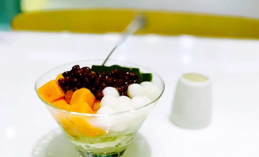 小妍子听说过很多次,这是第一次吃。店里装潢风格是粉蓝色,小清新。晚餐后去的,可能时间有些晚了,有些食材没有了。杏仁豆腐,口感清新,杏仁味浓,配料有薏米和莲子,我去的时候莲子没有了,只能换成芋圆,另一款有抹茶冻的不知道叫啥名字,里面还有红豆,芋圆和冰粉,朋友一致觉得里面的抹茶冻好吃。酸奶比预期好吃,比平时吃的少点酸少点甜,开心。