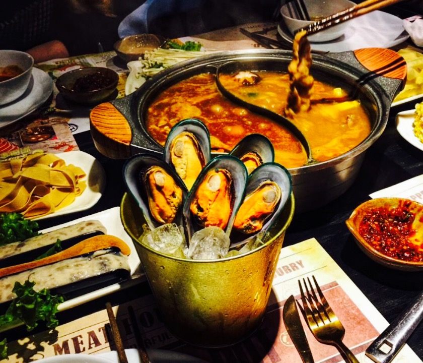 胡喱。现在火锅各种各样花样百出,这家噱头也是可以的,咖喱锅主打,无法想象。印象城太白南路负一层对面是老长安小吃吧,位置挺好找,店里人也挺多。点了咖喱和黑胡椒,锅底都很浓稠味道也挺重,觉得很粘稠,尽管味道不错,还是喜欢川味火锅多一些。店里服务态度不错,餐具看起来很卫生,有一个年轻小帅哥的服务生,老板娘看起来很潮啊。最后锅里一定要下一份面他们家特有的,顶饱入味又美味。