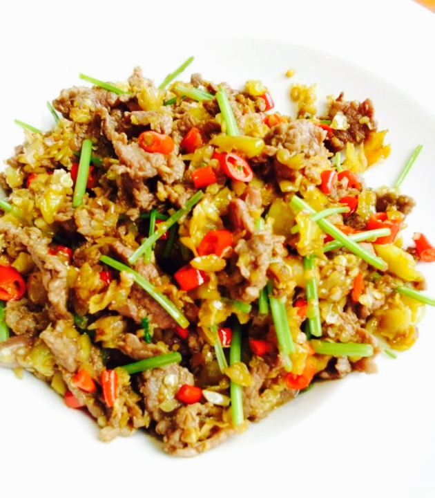 小炒黄牛肉,三颗辣椒,红椒加泡椒,不会吃辣的人会把你辣哭,能吃辣的会认为很入味很下酒