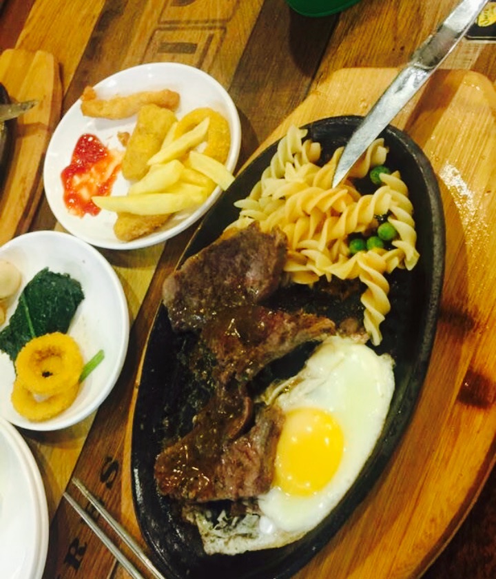 大约是九月份去的吧,带着侄子一共四个人去的。小孩110以下不收钱,感觉挺合理的。【地址】万达广场四楼,周末人超级多,我们去的时候十一点多,到十二点的时候,外面就排起了长队。【服务】,态度很好,一个阿姨说,不要给小孩喝饮品,让好好吃饭,好暖心。其它服务员看见你快用餐完,就会主动问还需要点牛排不。【环境】谈不上什么风格,地方其实挺拥挤的,大部分放置了摆台,简约干净就可以了。小小的空间都利用起来了,还有两人座,小角落也不浪费。【菜品】重点是牛排不限量,基本一个成年男人可以吃三块牛排的??菲力牛排很嫩,黑椒牛排是主打,羊排也很有风格,侄子说挺好吃的。还有其它小吃了,真心鲜美,娃娃吃的很开心。【整体】体验感很棒,饮品很多,这个价钱是中等。