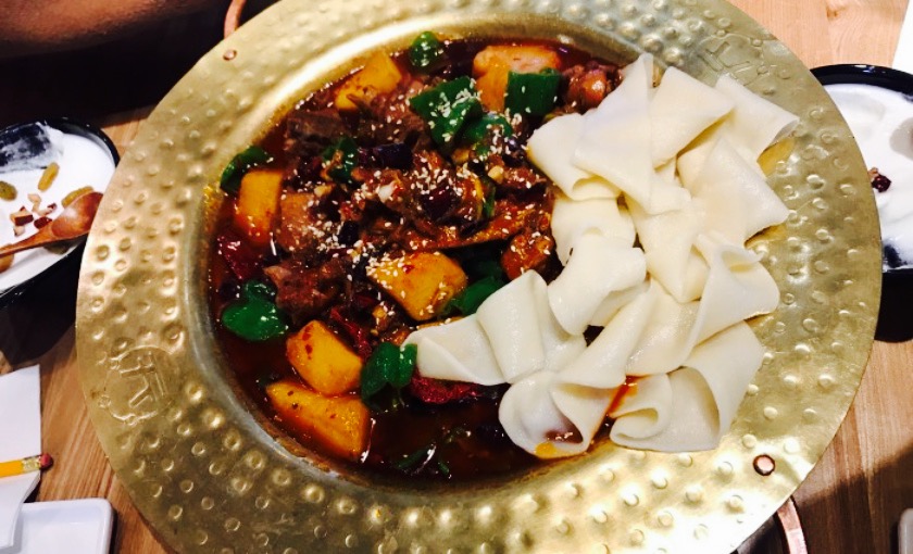 (位置)天山传奇位于新牌坊新光天地6楼。(环境)店内面积不大,风格现代中不失少数民族的风情。(味道)哈萨克烤羊排,22元一例。一例羊排其实就是一根羊肋骨,两三个人用餐较为合适。其外皮酥香,肉质特别嫩,或者可以用烂来形容,肥瘦相间,吃起来肉香四溢,稍微有些肥腻,但是可以通过干辣椒面来中和。除了肉质本身的香味外,还带有明显的蒜香,无不适的羊骚味。椒麻鸡,36元。鸡肉撕成条状,基本无骨。肉质香嫩,麻味明显,不偏苦。羊肉串,5元每串。铁签子串着的羊肉串个头不小,每串羊肉里都有肥有瘦,不过基本是以瘦肉为主。烤的不算干,肉质嫩,膻味淡。面上撒的作料味道不错。丝路凉皮,22元。传统凉皮做成了三种颜色,白色,绿色和紫色。另外两种应该加入蔬菜和火龙果吧。要是不仔细品尝对比,其实差别并不显著。当然了,颜值至上嘛。作料配好单独装盛,可以依据自己的口味进行添加。