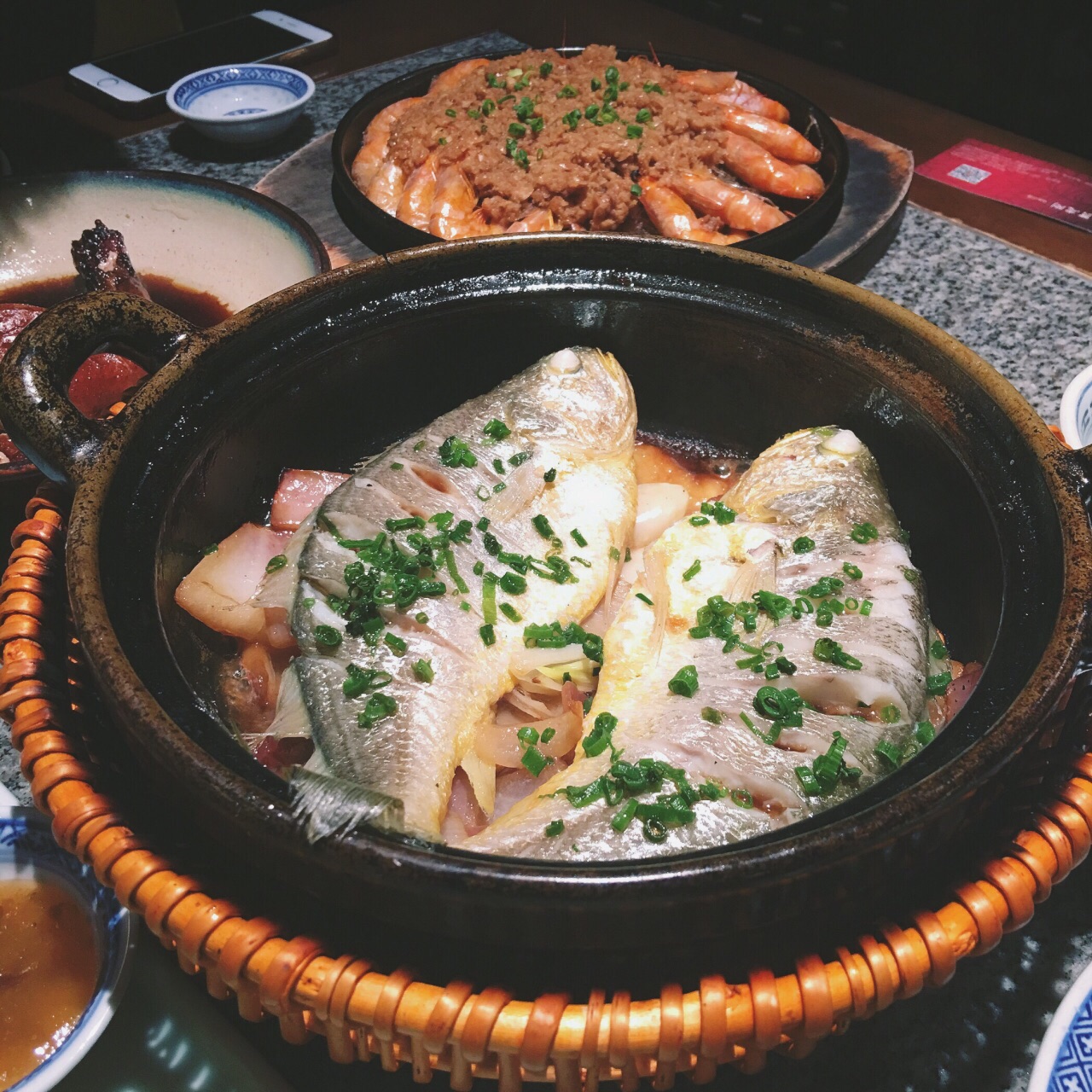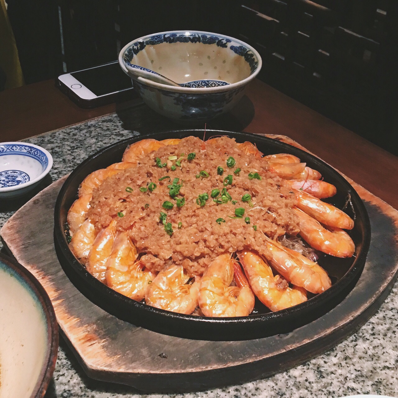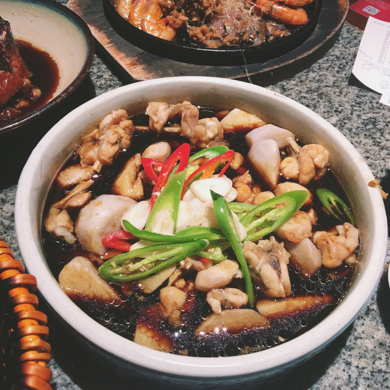 牛蛙味道挺特别的,很嫩,里面还有芋头,在一起挺好吃。蒜蓉铁板虾下面铺了层粉丝,很好吃,比外婆家的精致