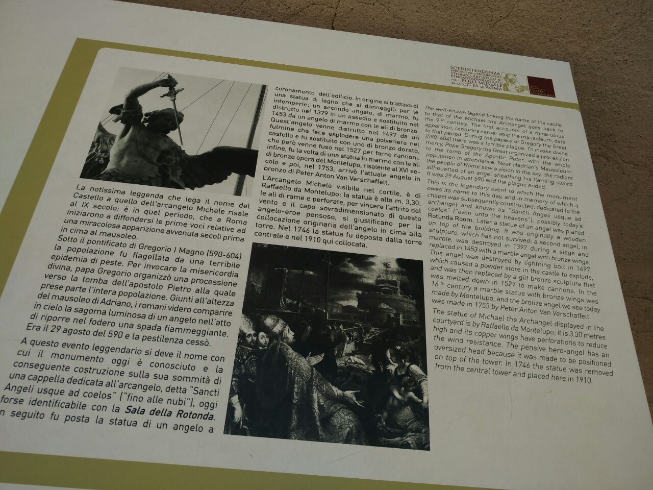 我们今天看见的位于罗马天使堡的中心最高处的这座3.3米高的雕塑,是1753年由Peter Anton Van Verschaffelt 制作的。这座雕像的历史要追踪到公元590年的罗马,最初是木头制作的很快就毁坏了,后来换成了大理石的,后期由于战争、雷击等等先后又毁坏了4次。我们现在看见的这尊雕像也曾经于1746年移走后于1910年搬回至现在的位置。