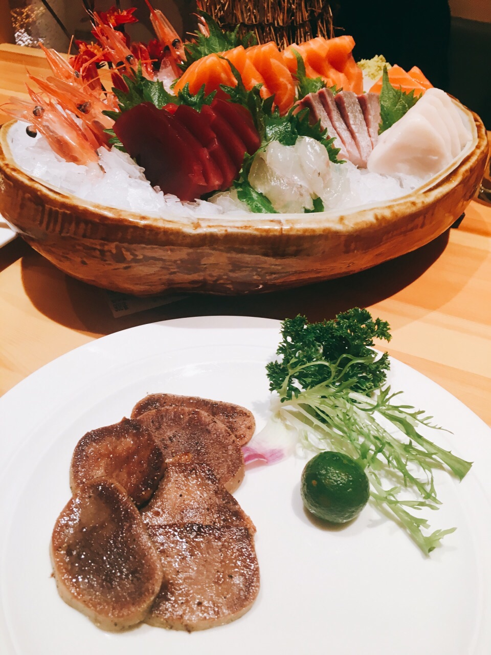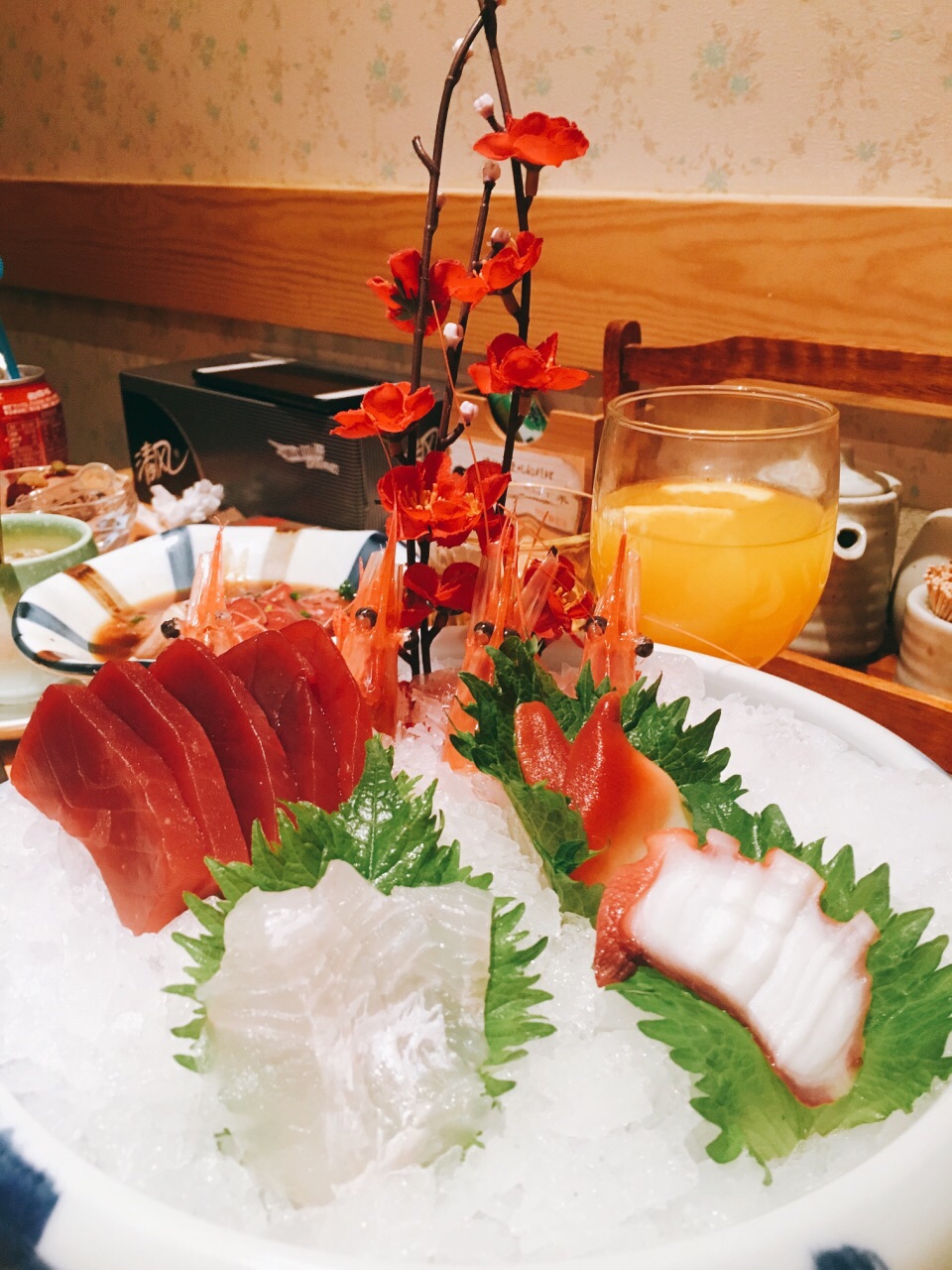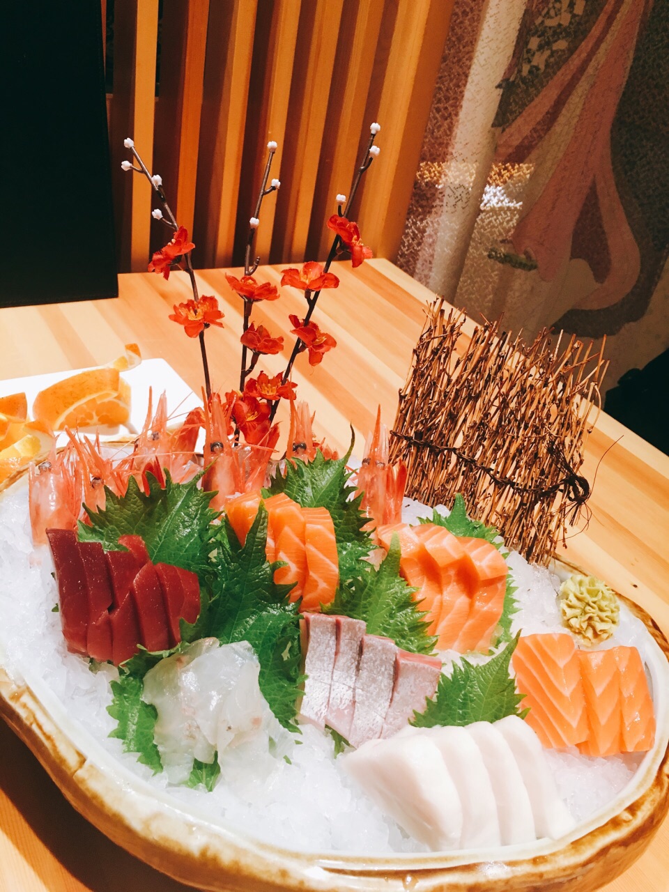 服务非常好,摆盘丝毫不马虎,最后刺身只要了几片,竟然还是按照标准刺身拼盘的规格,叶子花碎冰一点点铺好的。 两人位子也是一间间隔开的,座位宽敞,私密性很好。 刺身切片相当厚实,甜虾新鲜个头很大。 铁板烧也都不错,饮料、甜品都很实在,最后的提拉米苏给个好评,除了偏甜,奶味咖啡味都还蛮足的。 服务真的非常好,随叫随到,上菜也相当快,换盘子也很主动,晚市人太多忙不过来,一开始是让我们自己铅笔写单子的,字写得潦草的几个还会专门过来核对确认的,所以完全没漏单!态度措辞职业素养都很高,好评好评! 给店家一个建议,如果下雨天最好可以在收营那边放两个伞架,一来方便收纳地上也不容易留雨水,二来大包房门口走廊上就不会堆着一些伞看上去不太美观了。