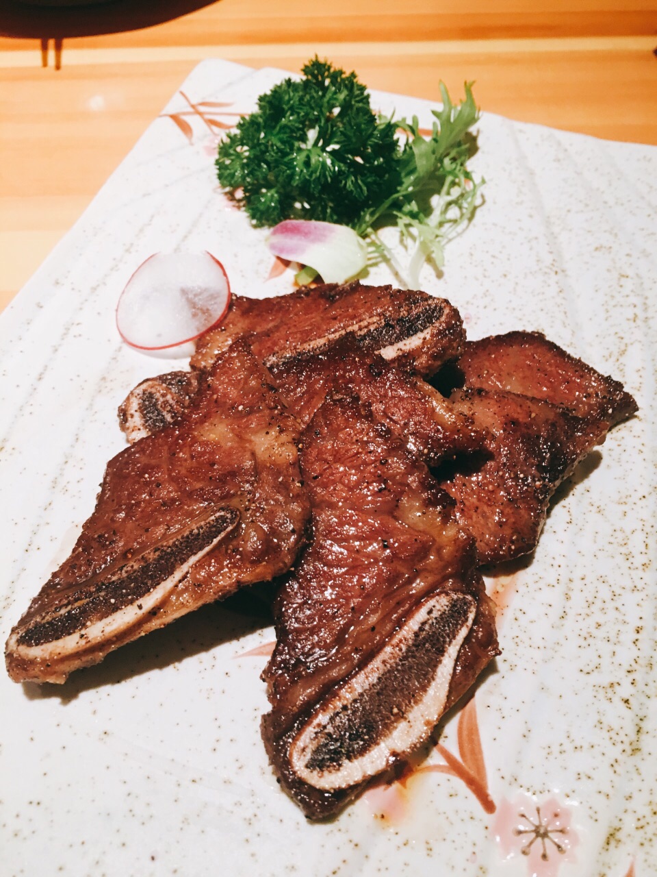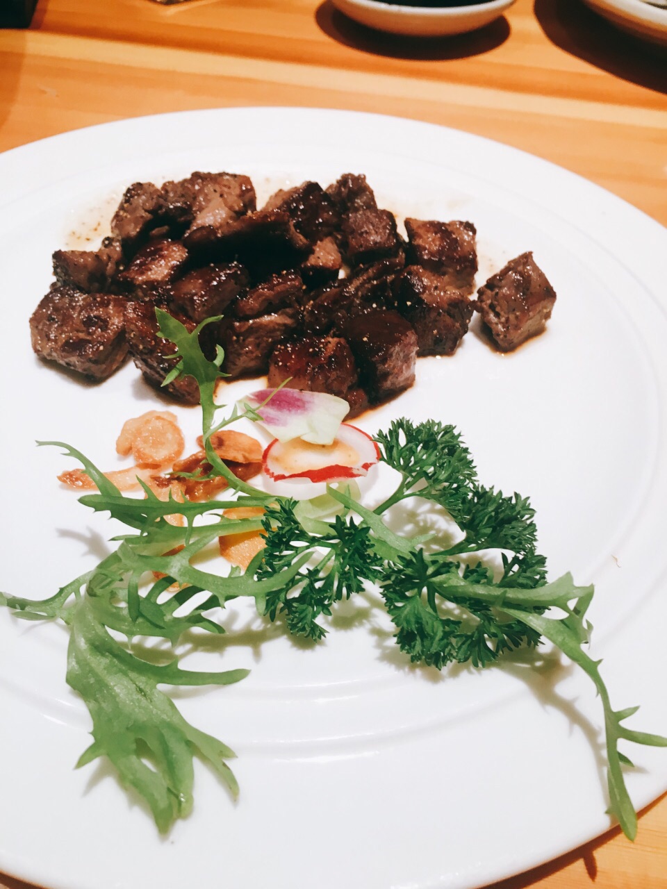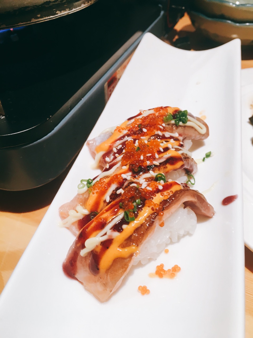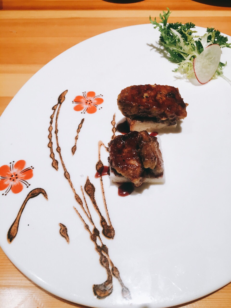服务非常好,摆盘丝毫不马虎,最后刺身只要了几片,竟然还是按照标准刺身拼盘的规格,叶子花碎冰一点点铺好的。 两人位子也是一间间隔开的,座位宽敞,私密性很好。 刺身切片相当厚实,甜虾新鲜个头很大。 铁板烧也都不错,饮料、甜品都很实在,最后的提拉米苏给个好评,除了偏甜,奶味咖啡味都还蛮足的。 服务真的非常好,随叫随到,上菜也相当快,换盘子也很主动,晚市人太多忙不过来,一开始是让我们自己铅笔写单子的,字写得潦草的几个还会专门过来核对确认的,所以完全没漏单!态度措辞职业素养都很高,好评好评! 给店家一个建议,如果下雨天最好可以在收营那边放两个伞架,一来方便收纳地上也不容易留雨水,二来大包房门口走廊上就不会堆着一些伞看上去不太美观了。