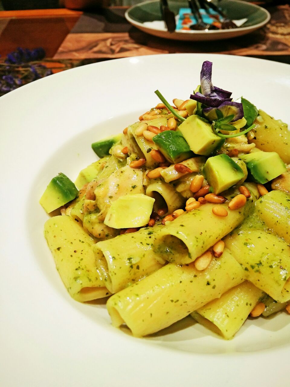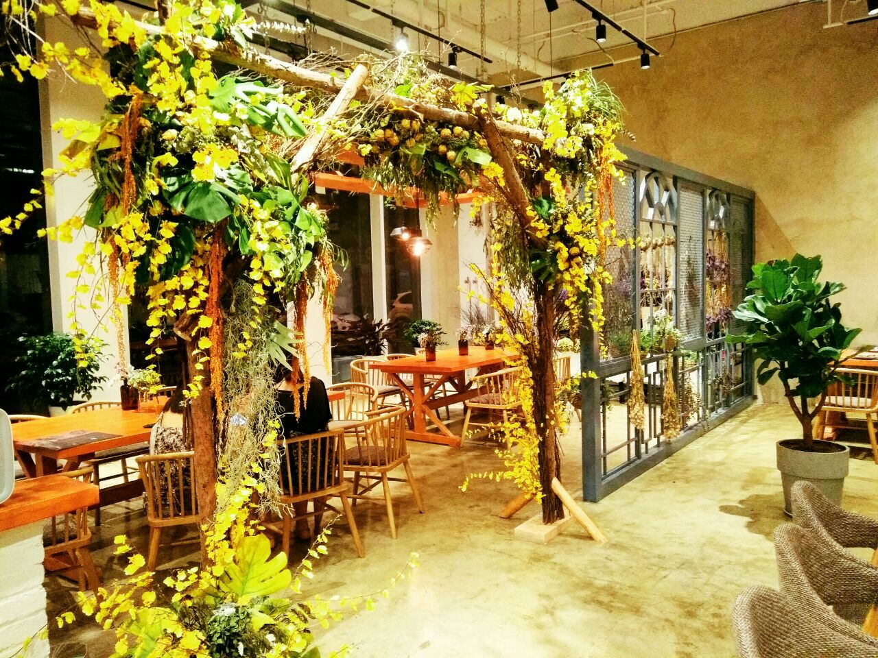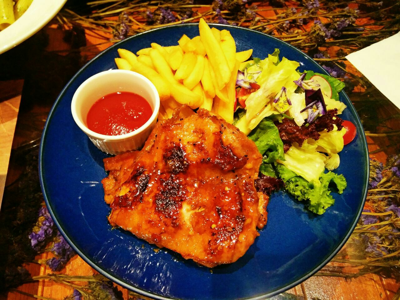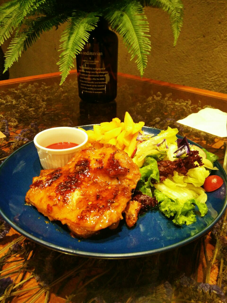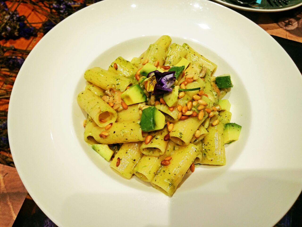 (⁎⚈᷀᷁ᴗ⚈᷀᷁⁎)金牌小吃货,#阿歹小盆友# 在花丛中吃饭还是第一次,自然森系让人觉得好舒服 热推的三样招牌都很棒,沙拉美哭,南瓜用蜂蜜喂过,清新的瓜果香。第一次点出了小意外,一只花虫可能闻到了甜味飞到了沙拉里找不到了,就拜托小哥又重做了一份。 泰式烤鸡排算是一个重口味,甜辣的泰辣酱,鸡肉烤的焦香四溢。还搭配了薯条跟沙拉。 意面是传统的青酱口味,还搭配了牛油果,绿油油的好诱人,意面湿度刚刚好,不会水水的挂不住酱。 以上两个人吃饱饱~绝对不是飘胃兔兔草ʚتɞ