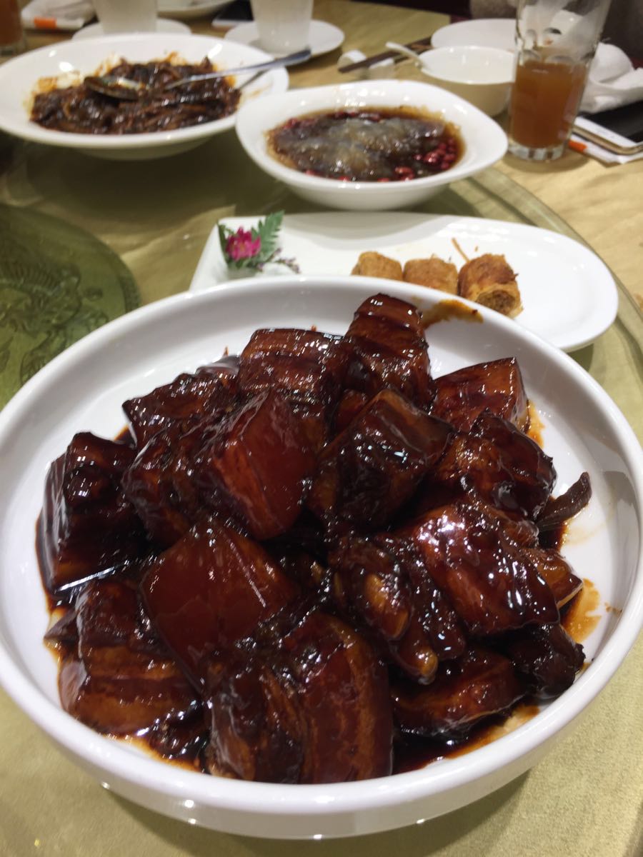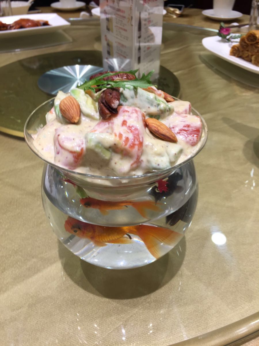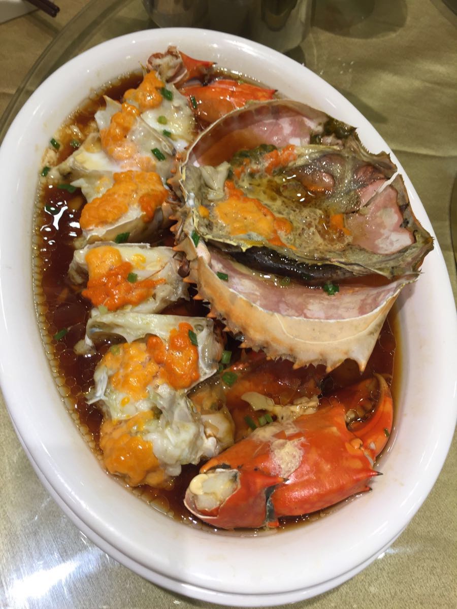 与朋友在遵义南路88号协泰中心三楼的顺风大酒店聚会,这是阔别顺风后的第一次。 如今的协泰中心内部看上去有点陈旧,但进入顺风后,其装修装饰等倒是感觉耳目一新,气势蛮大的。 看了菜单,️过去熟悉的,️推陈出新的,因此,照着这个思路,兼而有之。出菜的速度很快,首先第一感觉是,顺风现在的菜盘,摆盘很漂亮,也很标新立异,视觉效果很好。 因为视觉好,味蕾很快打开,我们按照上菜节奏,逐一品尝。 今天点的菜基本按照每人一冷一热的比例,一开始还担心量不够,但此担心已被足足的菜量所打消。 冷菜的色香味都很好,如手撕上海咸鸡、老醋海蜇头、墨鱼大烤,尤其是牛油果三文鱼,不但食材新鲜,酱料调得好,托盘用的是有两条小鱼游动的小鱼缸,立意独特! 热菜的色香味总体也很好,如葱油红膏蟹、石烤虾、干煎小鲳鱼、鳝糊、红烧肉、蜗牛土豆泥、草鸡蛋炒木耳等,但鲍汁凤爪虽酥烂,鲍汁味不够浓郁;煎臭豆腐过于焦黄,味道有点苦。这两只菜无伤全局,相信顺风以后一定会注意的。 在这次就餐中,服务人员中规中矩,热情细致,应该点赞