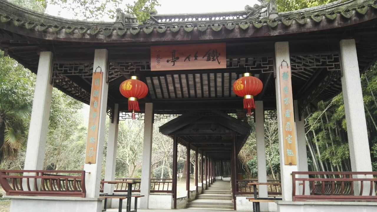 进入穹窿山景区大门,经过丹泉,就见不远处有一亭,上写铁竹亭三字。与一般的亭台略有不同的是,此亭有较长的廊道,通往上山方向。此处修竹青翠,清新之气迎面而来。上山步道由此始,下山则可在此休息,不失为休憇好去处。