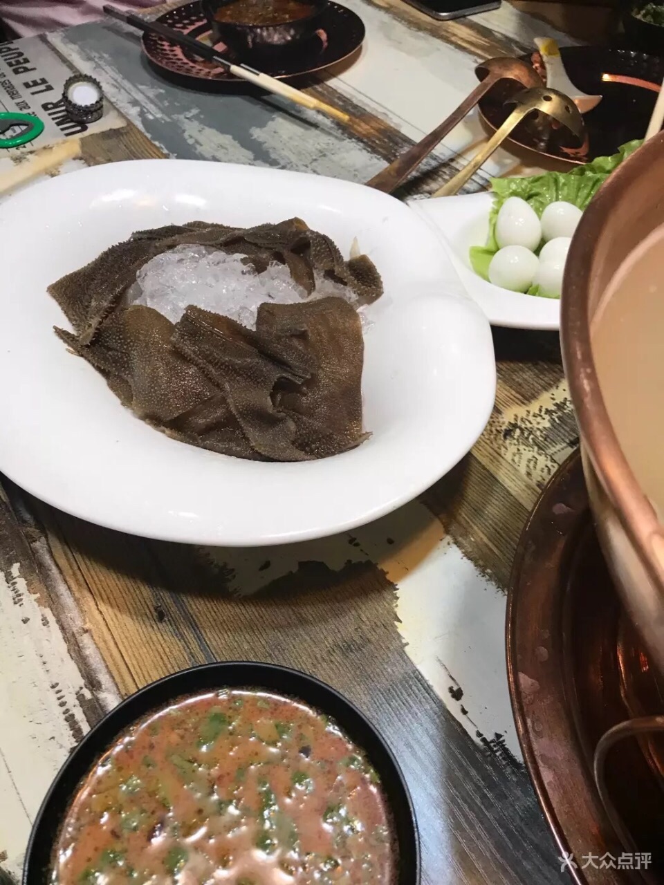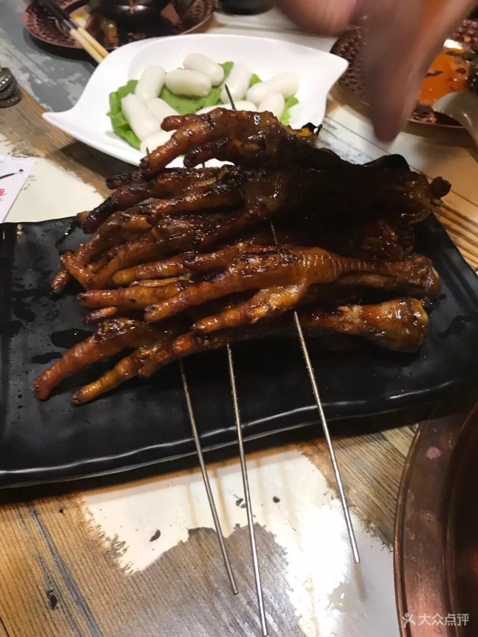 之前去吃的,这家貌似开了一年左右吧,经常路过,拔草还是第一次,进去后门口有卖盒饭的车子,估计工作日中午还兼卖盒饭,上楼层高有些压抑,灯光略显昏暗,吃了火锅和烧烤,先说下好的,烧烤部分一个凤爪不错,无论是秘制的还是脆皮都很好吃,折算下来6元一个还算物有所值,另外烤面包片也不错,是第一次吃到这种风味,火锅部分一个无骨凤爪品质不错,挺好吃,另外一个是毛肚也不错,接着说下一般的部分菜品,烧烤方面一个羊肉串一般,肉烤过了有点干,火锅方面一个是热气羊肉一般,肉有些柴,另外午餐肉品质一般,面粉感太重,值得吐槽的是他们家的服务很是糟糕,一开始给火锅底部加水倒在外面,全程没来换过骨碟,一个脆皮鸡爪等了一个半小时才上,虽然服务员说过脆皮鸡爪会比较慢,但显然这样的缓慢度已经超出了预期,总体来看这家店的菜品还是值得一吃的,但服务真的要跟上了