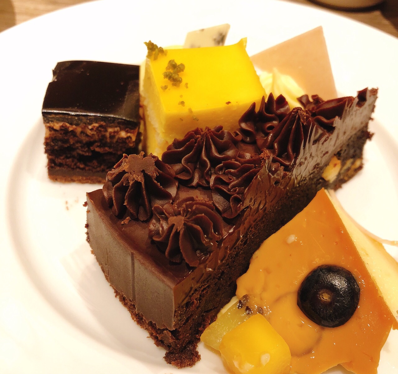 因机缘巧合 和老公去凯悦自助餐 过了个结婚纪念日 这里自助餐的生意很好 所以必须要提前预约 海鲜种类并不多 牛羊排值得一试 现在冬天 有自助小火锅 使得自助餐不会冷冰冰 最好吃的应该是甜点了 首选推荐巧克力蛋糕 如配图 甜而不腻 冰激淋也不错