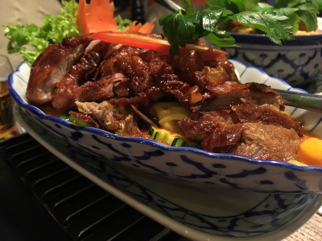 炸鸭红咖喱 鸭皮不够脆 毛没有除干净(虽然对这里的鸭子没有毛除干净这个期望,鸭肉太干偏老 咖喱...炸鸭红咖喱 鸭皮不够脆 毛没有除干净(虽然对这里的鸭子没有毛除干净这个期望,鸭肉太干偏老 咖喱第一口吃还不错 多品几口尝到苦味了不知道是某种香料煸久了还是怎样…
