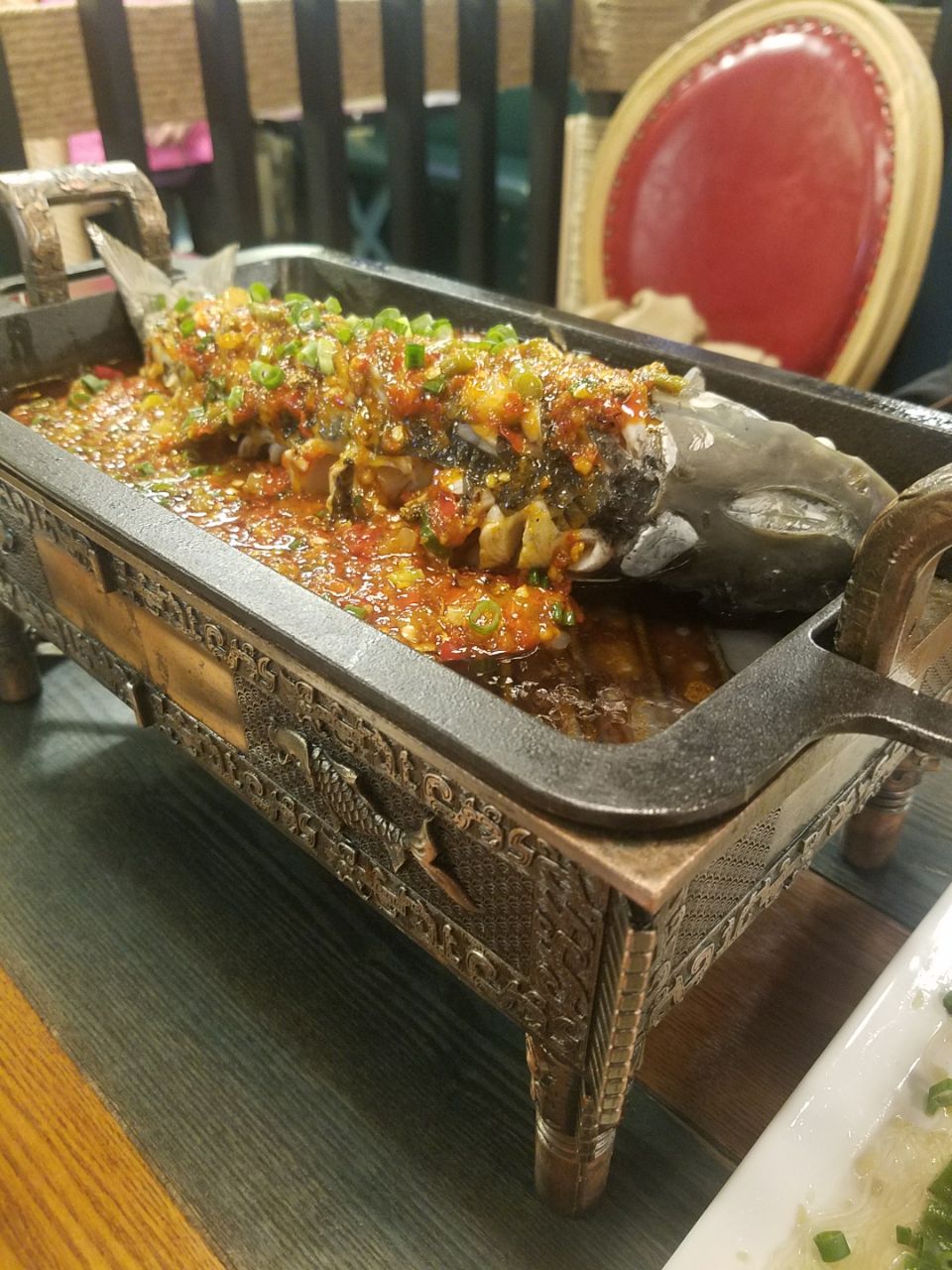 地铁2号线E1E2出口出来就是香槟广场,招牌比较显眼,很好找,上到三楼就是。铺子里面是两层,下面是卡座,楼上还有包间。装修有点新疆风格,比较小清新,因为原来这里是做新疆餐的,最近改成川菜,所以餐厅设施都比较新。整个环境干净整洁。味道整体不错,比较符合我的口味。怪味肉是冷菜,甜中带辣,适合下酒。纸包笋炸过,里面有笋丁,又香又脆。招牌鱼有点大,泡椒味道鲜美。蒸秋葵是用粉丝蒜蓉蒸的,秋葵很嫩,好吃。餐厅服务也很周到。