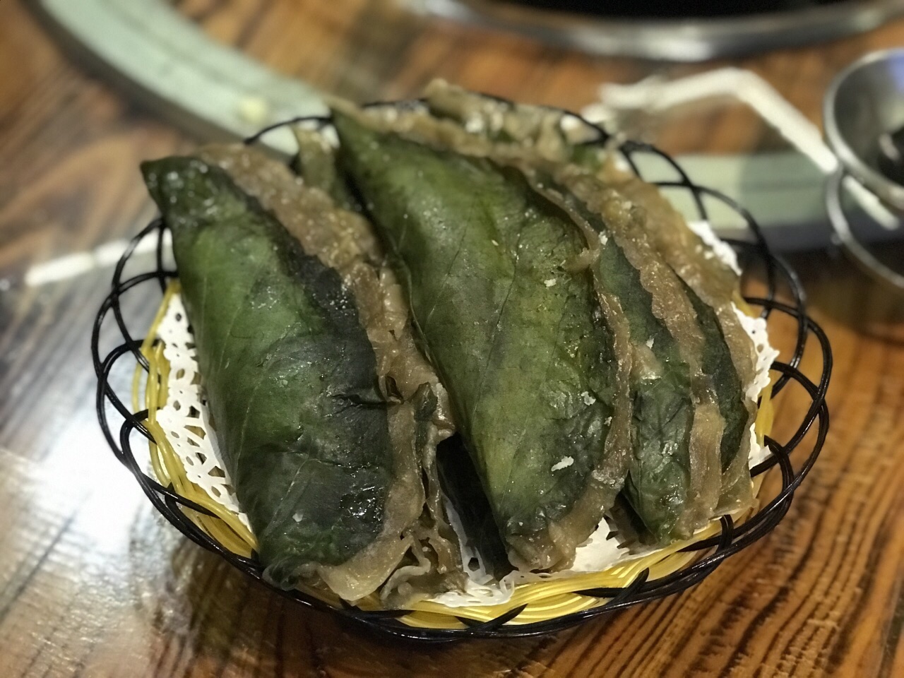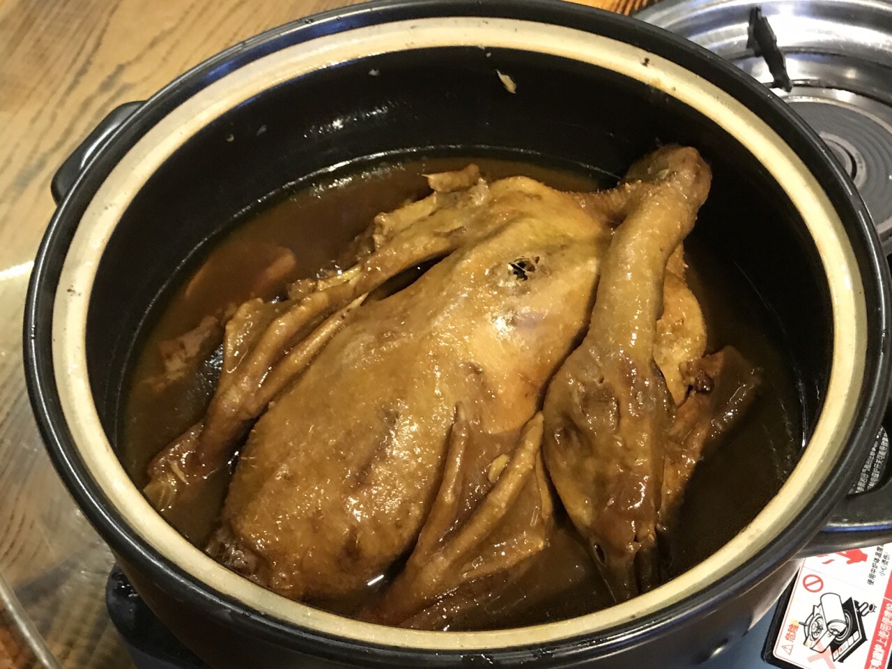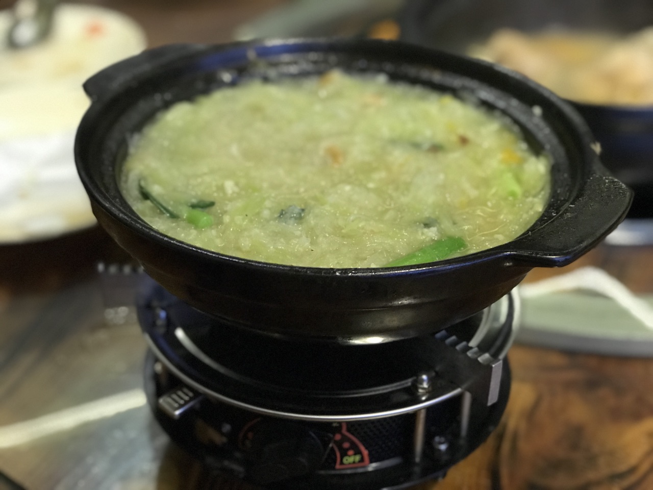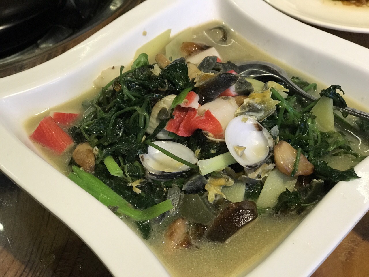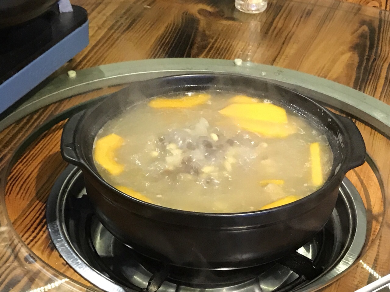 琼海几位书法爱好者和老师约我共进午餐。天气寒冷,老师提前一天订了一个焖鸭煲。筷子一夹,焖了几个小时的鸭肉就脱骨了。老师把鸭掌和鸭腿夹给我。哇!鸭肉闷得很入味,好好吃! 我在新加坡吃不到鹅肉,所以他们为我点了一小份烧鹅。不记得那汤是什么名字,里面有红豆、黄豆和金瓜,非常好喝。我喝了三碗。 饭后甜点是树叶饼。有我喜欢的椰丝馅,很好吃。吃得好饱,非常满意的午餐。