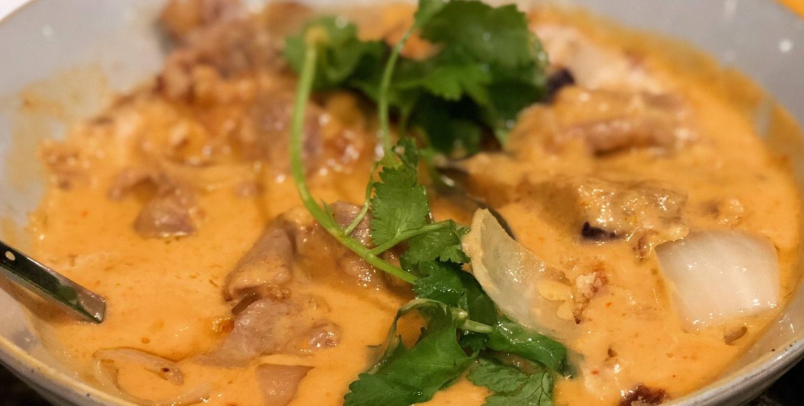 青花,环境超级美腻的泰越印融合菜,前菜的旺来沙律偏甜口,牙口不好的人一定要小心里面大块的青木瓜。正餐比较喜欢红咖喱牛肉,肉分量很足,配菜里还有荔枝和青提,蟹肉炒饭和喇沙大虾面都属于好吃不惊艳~饮品强推泰式奶盖茶,咸口奶盖和泰奶太配了疯狂打call。