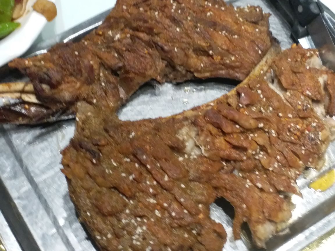 烤羊腿味道不错 应该是先煮后烤,肉质较嫩。 包厢空间太小,只放的下桌椅。