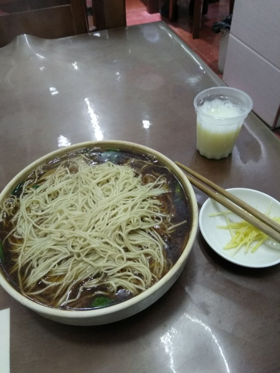 每次去镇江,下火车先去张二吃碗面,然后找酒店住下。他的面绝对镇江前三。这次是1月5日到的,踏着积雪背着包,提着麻花和书包。他的面的量是我吃过锅盖面里最大的。就是有点咸,不过有免费豆浆,我喝了三杯,狠好喝。
