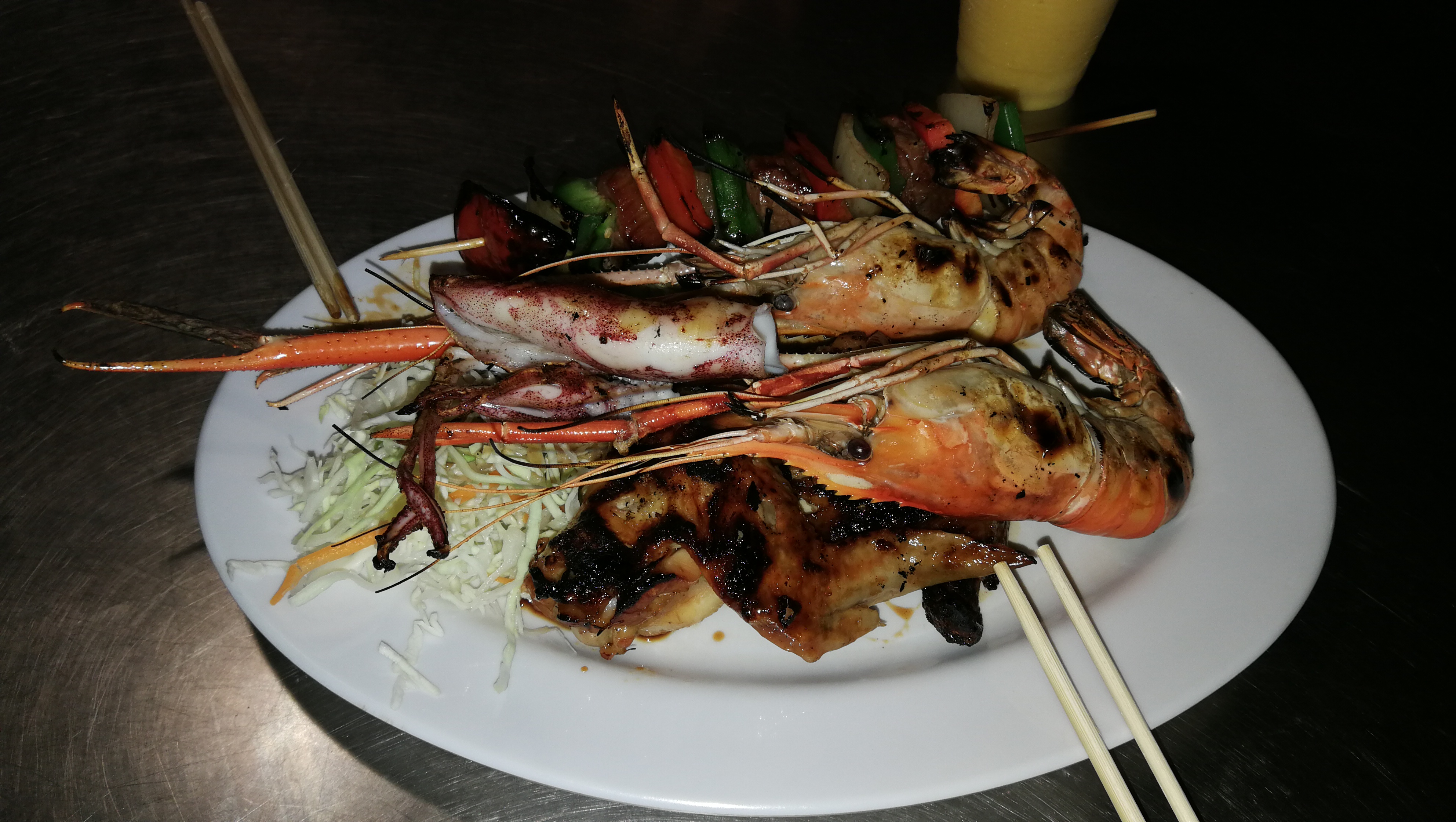 在酒吧街的三角形路口,一家露天的烧烤店,厨师特别爱现,时而火光冲天,时而锅铲飞天,引来不少人驻足不前在酒吧街的三角形路口,一家露天的烧烤店,厨师特别爱现,时而火光冲天,时而锅铲飞天,引来不少人驻足不前。就是大排档的环境,不锈钢桌面有点油腻,烧烤很一般,只有鱿鱼和虾很嫩,其他的肉都偏老。