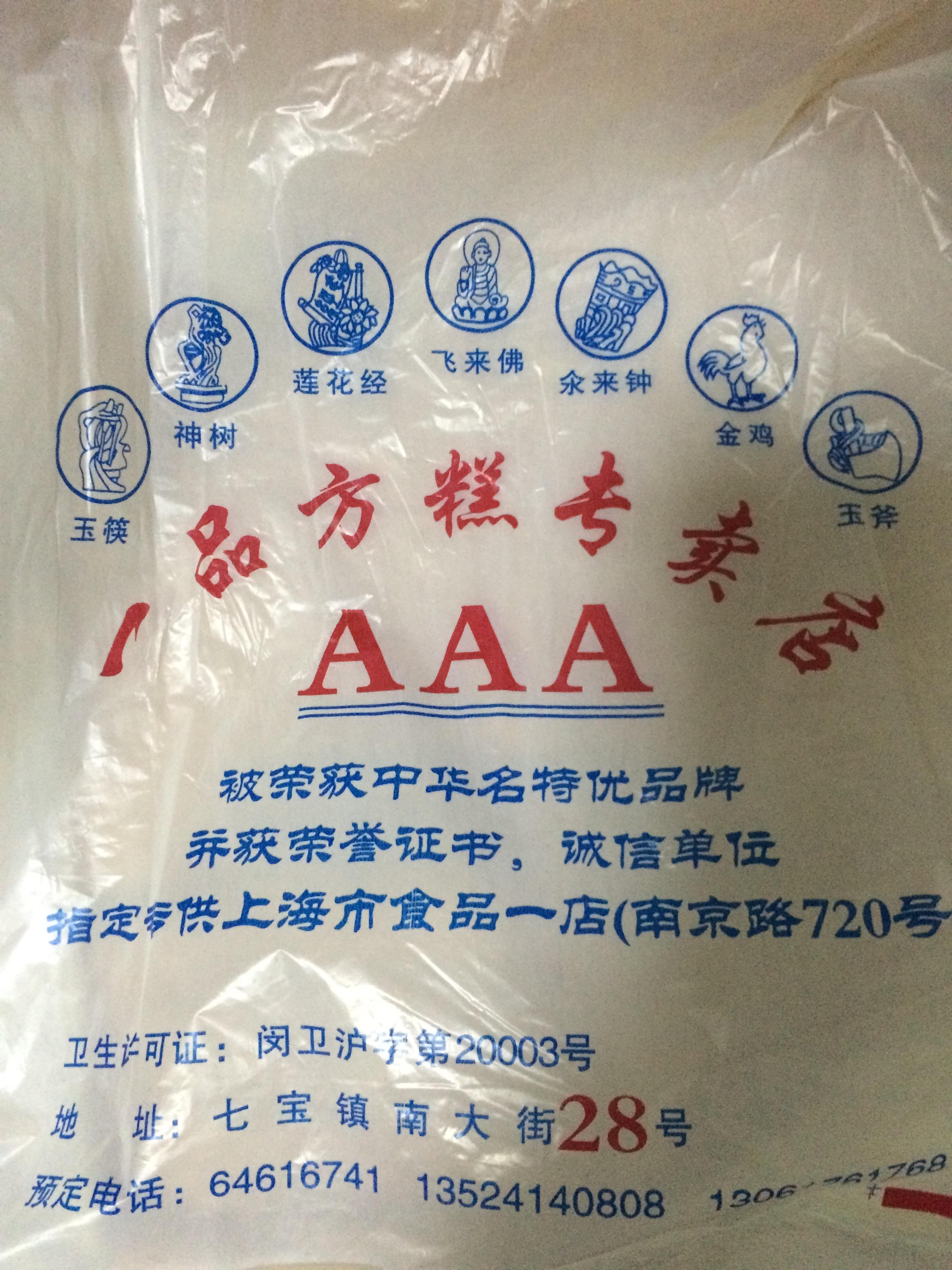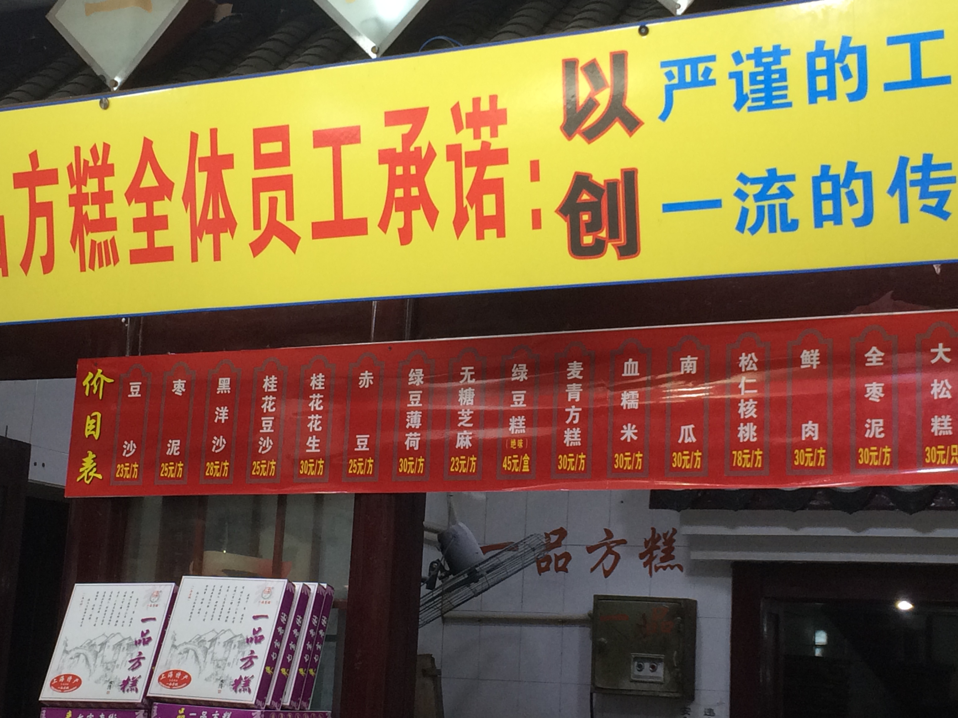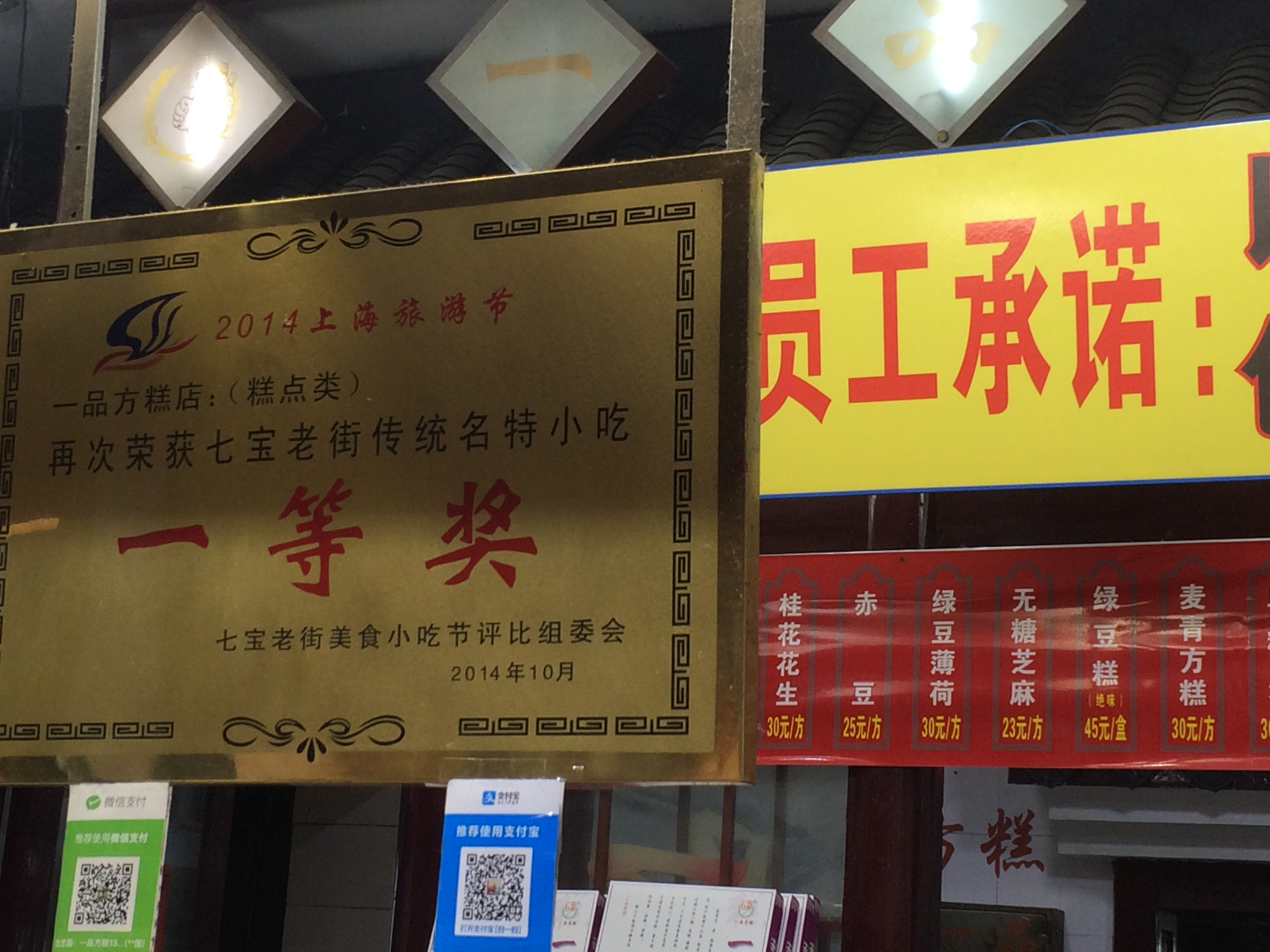 七宝老街卖一品方糕的店家不少,但这家貌似资格比较老,店面挂有“七宝老街传统名特小吃”一等奖的奖牌(不过已经是2014年的奖牌了),方糕品种蛮多的,所以就买了一些不同口味的方糕回来,有豆沙的,有黑洋酥的,有南瓜口味的,南瓜口味的里面也有豆沙,馅儿的量要比其他店家的多,但感觉味道好像不如其他店家的。价格也要比其他店家的贵,估计一方面是馅儿多(货真价实)的缘故,另一方面可能与奖牌有关吧。