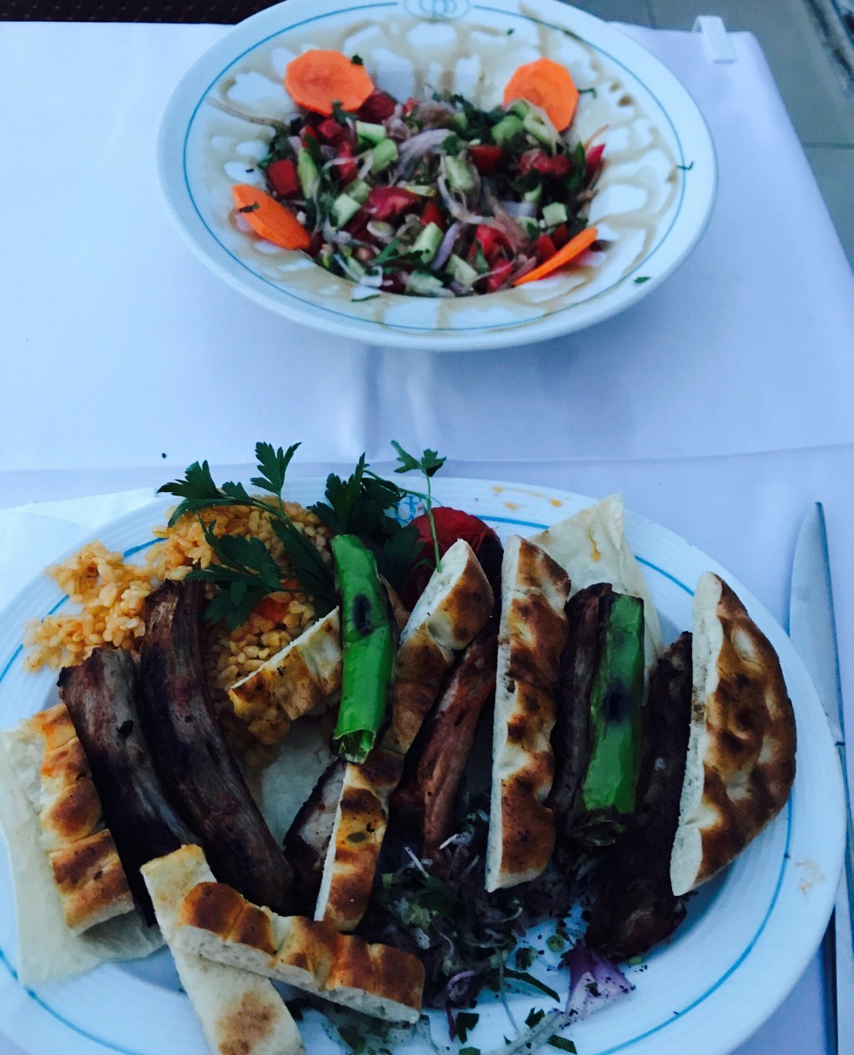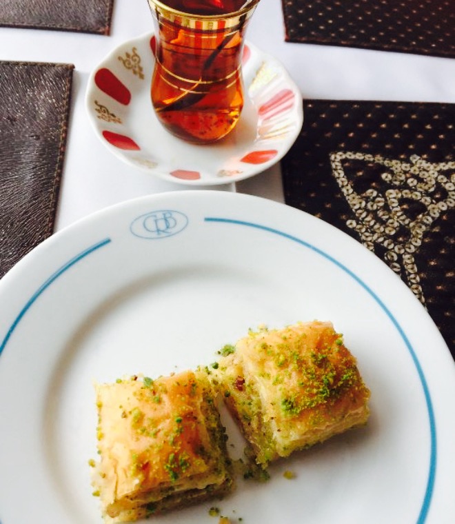 这个地方是一个隐藏的宝石,你可能不会偶然发现。但绝对值得一游!这家餐馆非常舒适,只有几张桌子和一个小阳台,有着城市和河流的美景。桌子上有蜡烛,我很喜欢正在播放的音乐(一个折衷的、冷的播放列表)。服务很好——接待我们的那位先生非常有效率,很友好,很细心。我们一准备好,他就有空了,我的酒杯也没空,因为他经常给我倒饮料。食物很快就准备好了,一切都很新鲜。我们有鹰嘴豆泥(这是与温暖的面包)为起动,然后我有烤鲷鱼和我的伙伴与酸奶有羊肉都好吃。当我们完成了板被清除,我们的点心有果仁蜜饼(好吃!)和免费茶。我们真的很喜欢食物,气氛温馨的当地酒店。我肯定会推荐这个地方给任何来伊斯坦布尔的人!