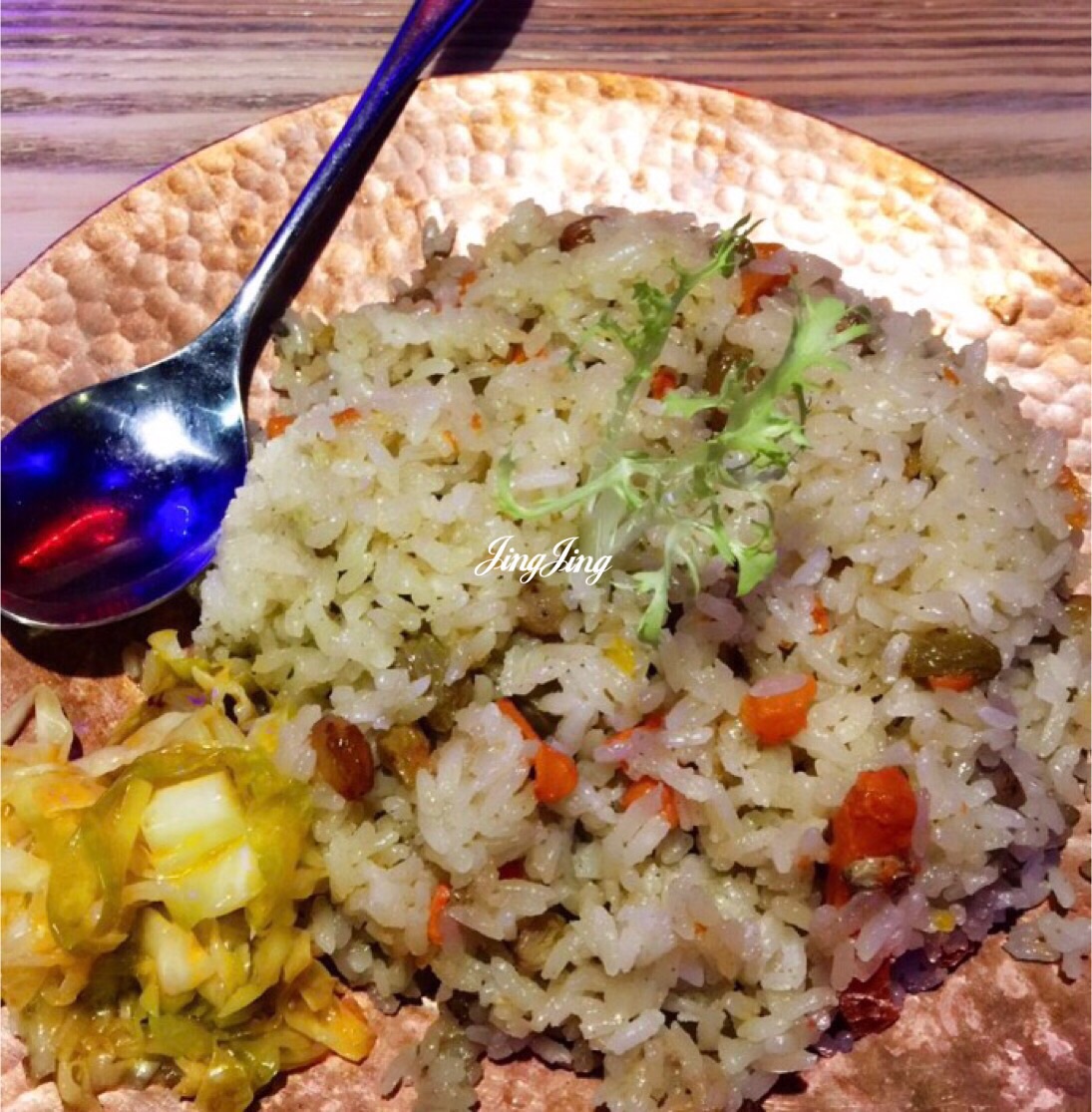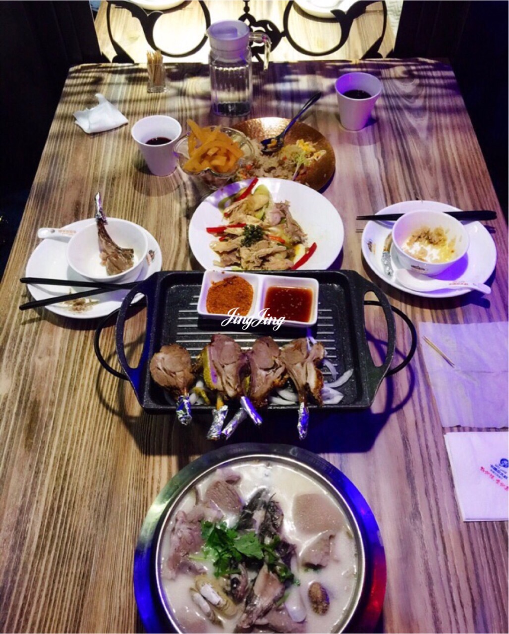天气转凉,需要补充能量抵抗台风。吃牛羊肉还是大西北的比较正宗,新疆餐厅现在越开越多,对我们吃货来说绝对是福音,谁家好吃去谁家。最近准备把富都广场这里开业的餐馆一个个吃过来,这家新疆餐厅比较有特色,门口有烧烤吧,新疆大叔坐镇各类烤串现点现烤。 ☞ 麻椒鸡:手撕鸡,鸡肉拆骨,和麻椒、大葱拌酱,比较爽口,但是鸡肉不是新疆的特色,调味比较好,鸡肉一般吧。 ☞ 手抓饭:葡萄干、辣白菜、胡萝卜炒饭,每个饭粒都蘸着肉汁和葡萄干的香甜,忒好吃! ☞ 烤羊排大份,之前已经烤好的,端上桌点明火再加热,羊肉肥瘦相宜,几乎没有肥肉,蘸上羊肉酱料和孜然胡椒面,羊肉特有的膻味,赞! ☞ 鱼羊一锅鲜:昂刺鱼两条、白切羊肉、羊肚、蛤蜊、蛏子、金针菇、粗面条……这锅汤,奶白奶白的,盛一碗喝一口,奶香味、羊肉鲜味、鱼肉贝类鲜美味融合一体,没有添加调味料,羊肉、羊肚特别足,这锅汤推荐!不足的是,昂刺鱼鱼腥味很重,蛏子不是正当时节,怀孕的,口感不好。但是一点不影响汤的鲜美口感。 有团购代金券,酒水、烧烤类不可抵用,也可以微信扫一扫加会员,可享受各菜式的会员价,每天店家还有一款特价菜,不过优惠不可共享,大家根据自己需要选择吧!