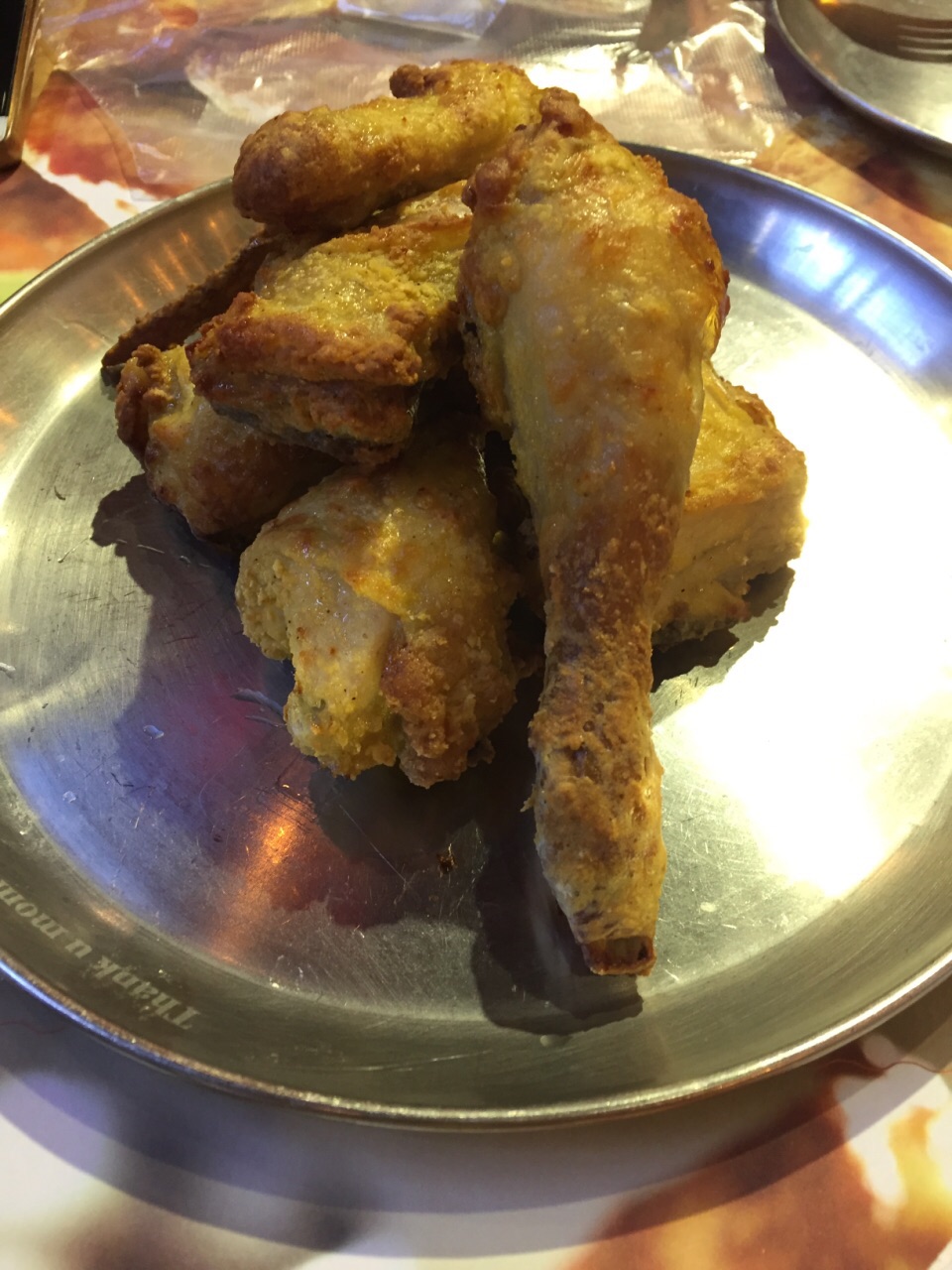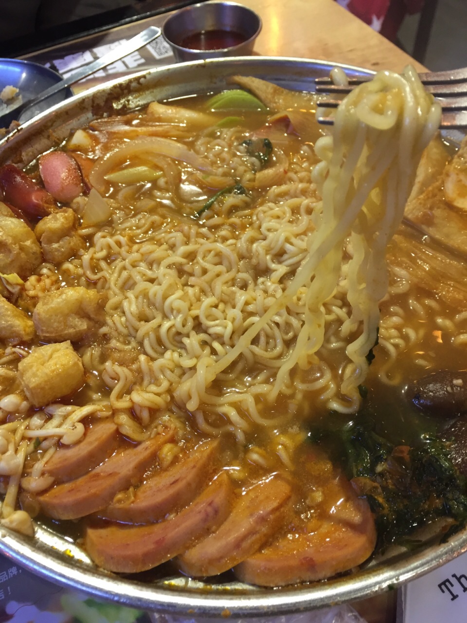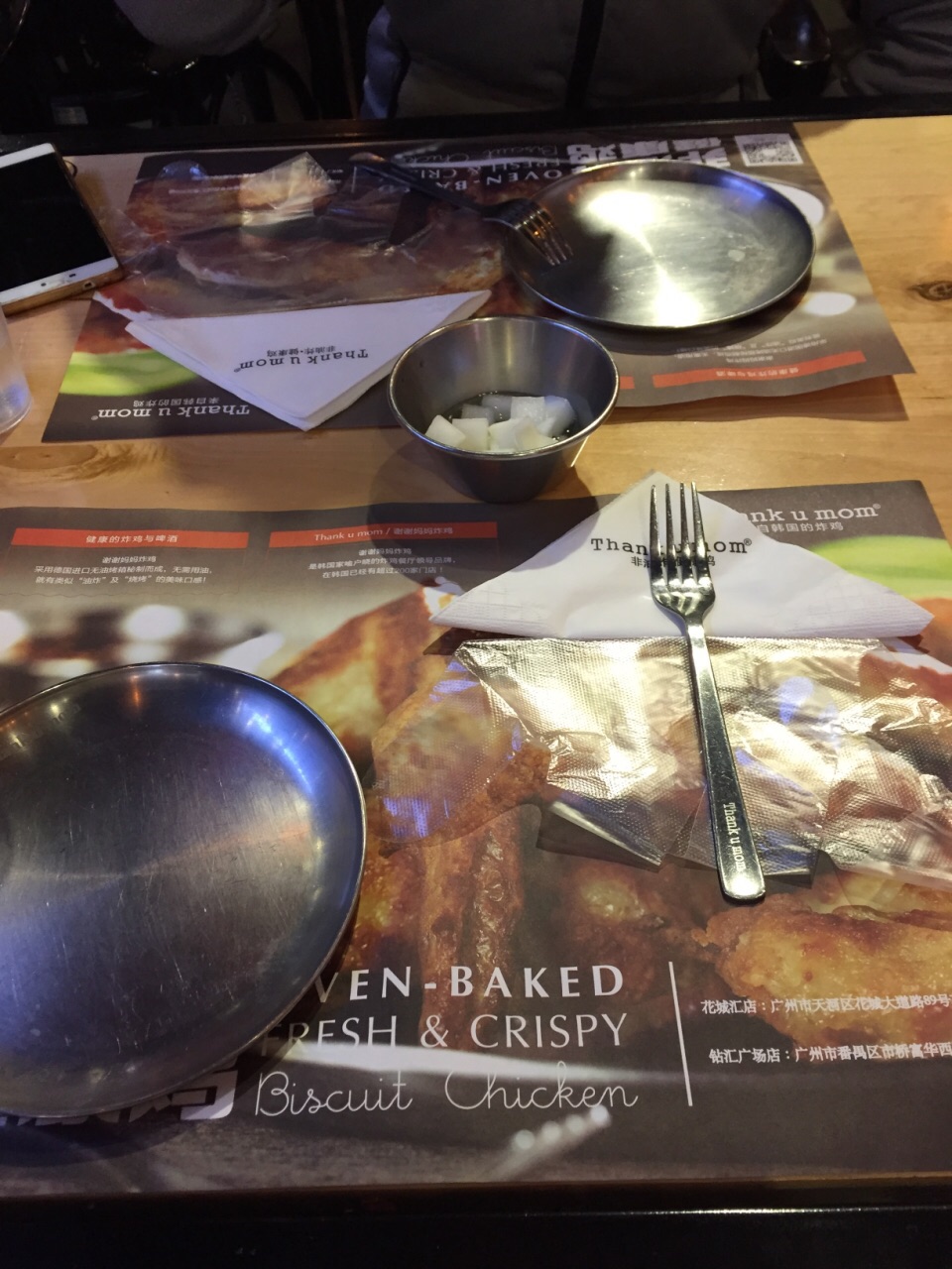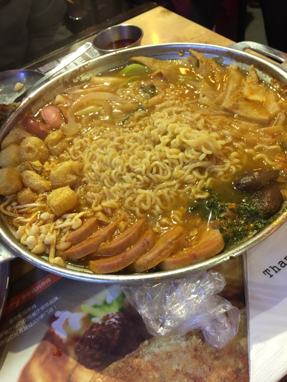 第一次吃thankumom的炸鸡和部队火锅,近期貌似都在搞活动,所以比较划算。 半只妈妈酱鸡39元,双人部队火锅58元,茶位费1元/位。 就餐高峰期,上菜比较慢,鸡的分量是7块。两支鸡腿,四块鸡肉,一只鸡中翅。味道不错。 火锅的味道和颜值就一般了,有点辣,而且菜类有点酸,面的劲道不错。肉类比较腻。 店内一直播韩国女团的歌,有点无聊。 点餐需要自己去前台下单,先付款后用餐。