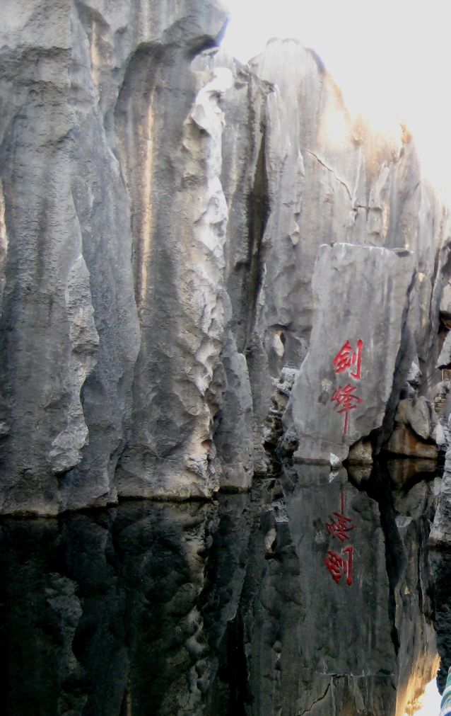 云南石林景区里有一个水潭非常平静,而边上的尖尖的像剑一样锋利的石头指向天空,这里被称为剑峰池。水池水静如镜倒影非常清晰!