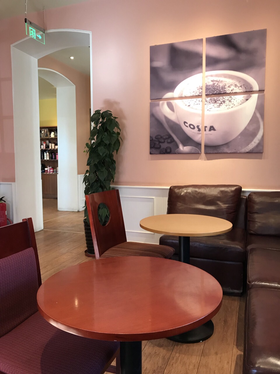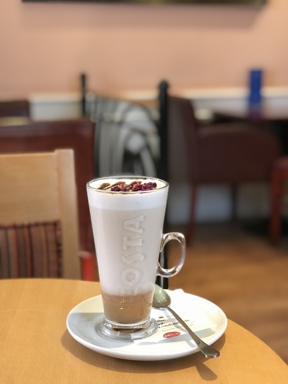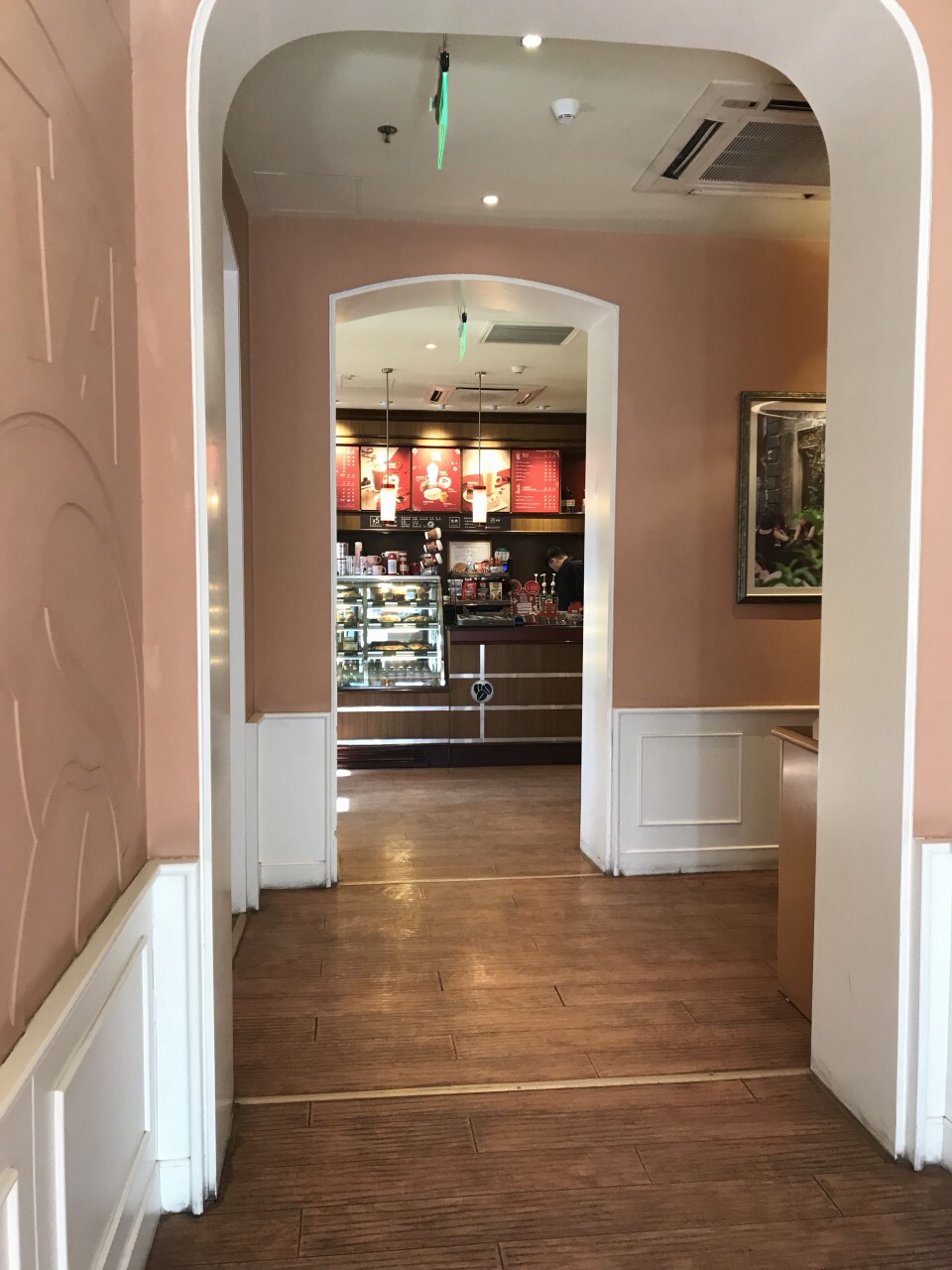 意大利风情区里的这家costa开在一幢小别墅里,环境自然是好得不要不要的,有好几个房间里可以坐下来喝东西,座位也挺舒适的。点了那个啥玫瑰拿铁,挺美的,不含咖啡因,喝起来就是奶茶的感觉,有淡淡的玫瑰味。服务一如既往地好。