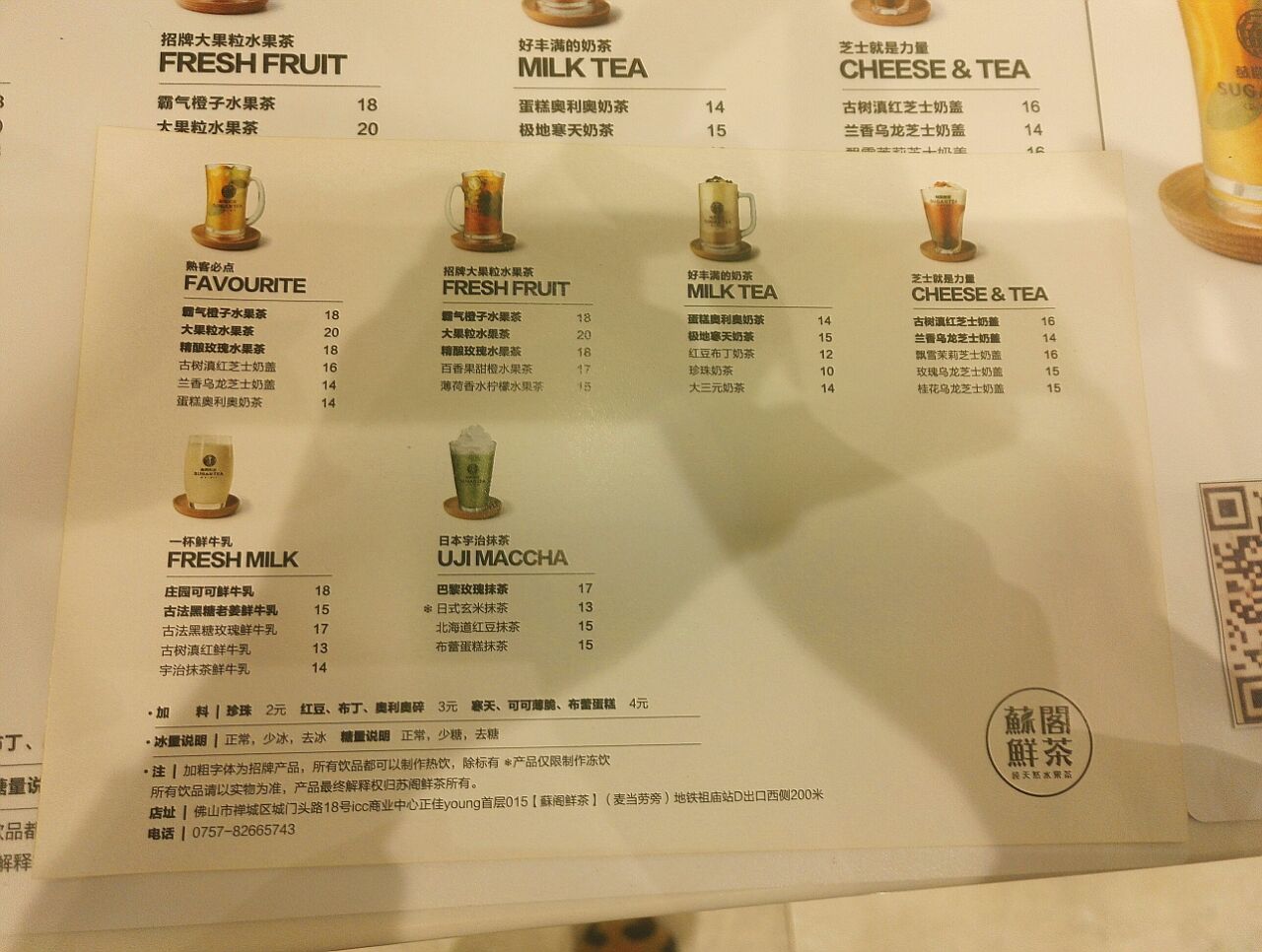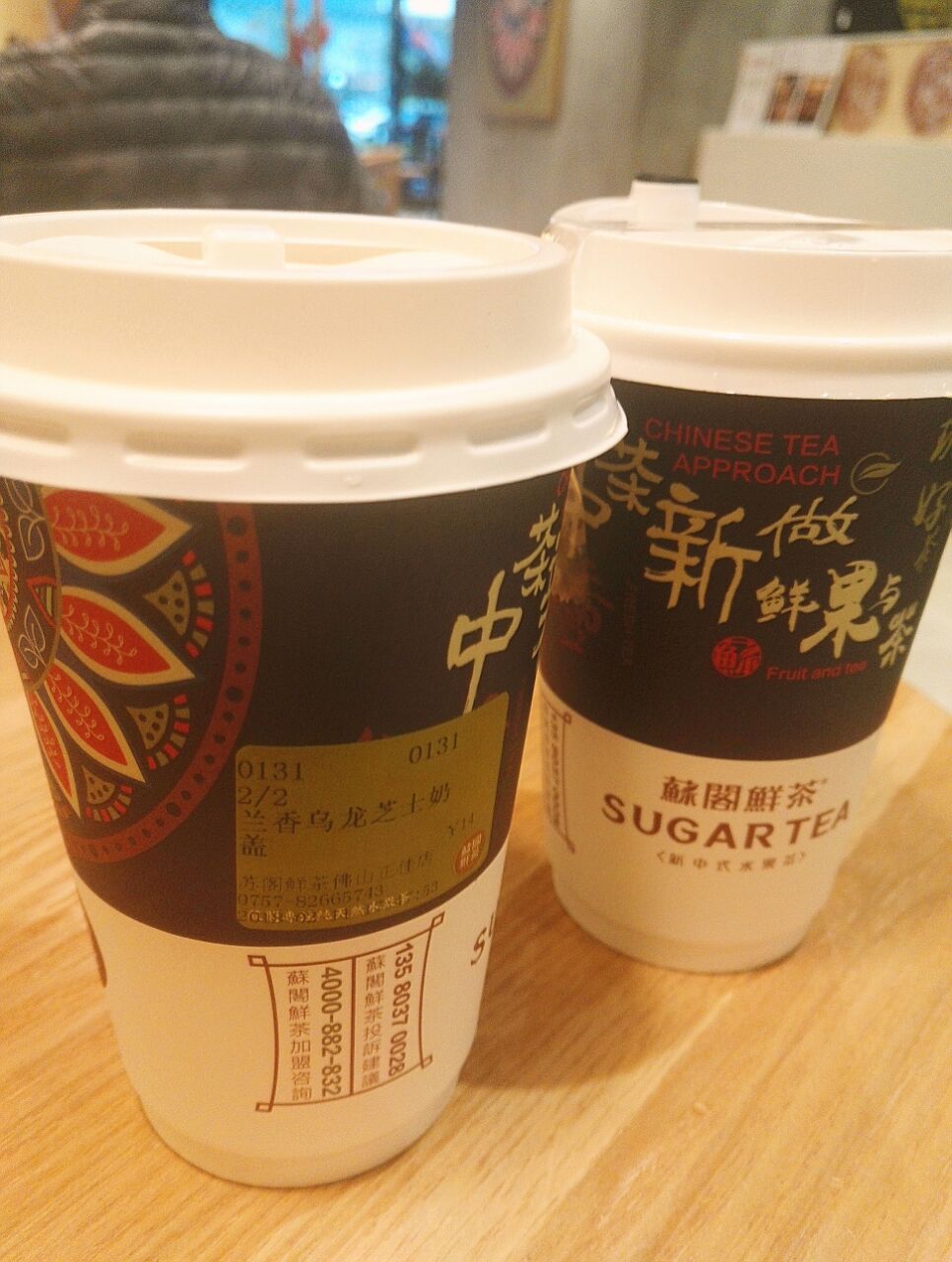 接近傍晚时分,冷风嗖嗖,恰好路过祖庙,便前往新开“蘇阁”,畅饮一杯。 【蘇阁鲜茶】位于建设二街11号6座正佳广场背后麦当劳旁边!正对着华辉大厦后面的停车场,所以停车问题不用担心! 店面还蛮宽敞的,木系为主,有点像森林系风格,环境还不错,座椅都配有靠垫,坐得更舒服,蛮贴心的! 店里的出品大概有二十多种口味,主要以奶茶,芝士奶盖,水果茶,牛乳,宇治抹茶为主!价格十多元左右! 去的当天在搞优惠,但只限四款饮品买一送一! 新店的话,我通常都是看颜值挑选的,所以选了【蛋糕奥利奥奶茶】,朋友选了【兰香乌龙芝士奶盖】! 顾客不算太多,所以制作过程不算太久!聊会天就到了! 【蛋糕奥利奥奶茶】:要了热的,第一下入口感觉很棒,蛋糕+奥利奥+奶茶的味道配合的很好,茶味蛮浓郁的,蛋糕奶也醇滑,总体味道又不会太甜!我个人是蛮喜欢的! 【兰香乌龙芝士奶盖】:奶盖好像没有贡茶的香,但也还可以,茶的话第一口感觉还不错,喝多了就感觉都差不多了! 总体出品还不错,外带的袋子也是很结实的,蛮不错,这次还看中了芝士木瓜,下次有机会再来品尝!