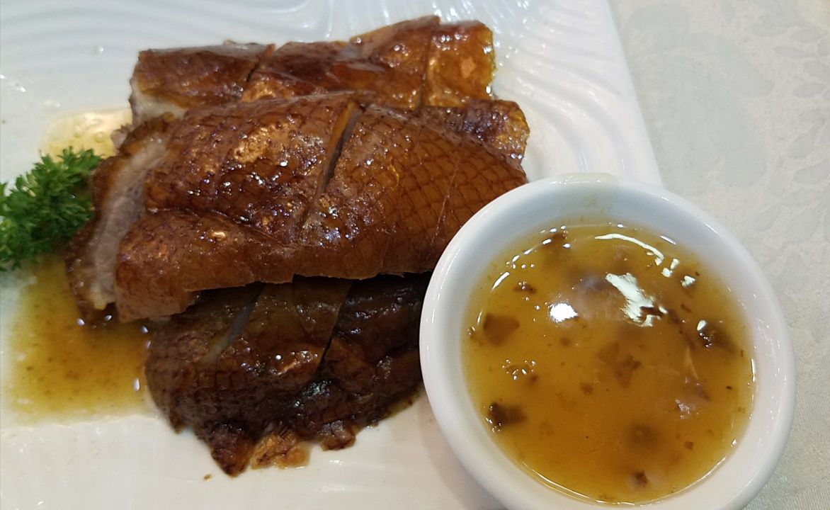住在这家店附近,头天晚上六点过去吃,满座,没吃成。第二天晚上八点去吃,有位子了,但是人还是多。点了一个至尊烧鹅,味道还行,皮子酥脆,不油,肉也较软,鹅太大了,肉好厚。铁板鱼扣不知道用鱼的什么部位做的,有点脆,还不错。服务也还不错。