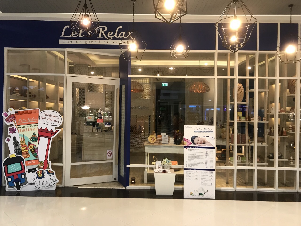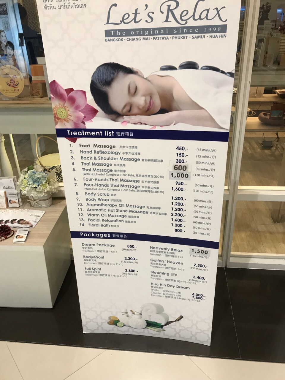 Let‘s relax spa是泰国连锁的按摩店,在曼谷普吉岛都有分店,华欣这家店在 market village商场内,有两层,通过网上预订有9折,一小时的泰式按摩大约110左右,包括十分钟的脚底按摩,按完有草药茶和饼干,但是预约时间没到就不能提前这点不好,服务态度也一般,贪图的是正规和环境舒适